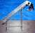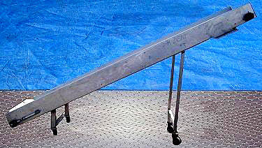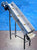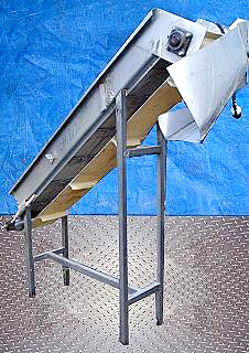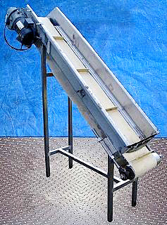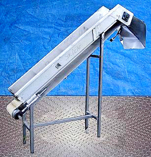 Stainless Steel Conveyor. Belt width: 11 in. Maximum aperture/clearance above belt. Cleat height: 1-1/2 in. Distance between cleats: 18-1/2 in. Dayton Motor, 1/2 hp, 3450 rpm, 115/230 V, 80/40 amps, 60 Hz, 3 phase. Motor Drive. Infeed height: 27 in. Exit height: 67 in. Overall dimensions: 72 in. L x 26 in. W x 72 in. H.