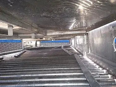 Stainless Steel Cooling Tunnel with Spray System. Product aperture/clearance: 8 ft. 1 in. W x 18-1/2 in. H. Infeed Conveyor uses (2) belts. Maximum product width: 5-1/2 in. W. Drive sprocket size: 6 in. dia. x 1 in. W with a 3/4 in. tooth pitch. Baldor Motor, 2 hp, 1725 rpm, 208-230/460 V, 6.5-6.2/3.1 amps, 60 Hz, 3 phase. Exit Conveyor maximum product width: 7-1/2 in. W. Drive sprocket: 6 in. dia. x 1/2 in. W with a 3/4 in. tooth pitch. Baldor Motor, 2 hp, 1740 rpm, 208-230/460 V, 6-6.5/2.8 amps, 60 Hz, 3 phase. Baldor Motor 2, 1/2 hp, 1725 rpm, 208-230/460 V, 1.8-1.6/.6 amps, 60 Hz, 3 phase. Baldor Gear Reducer, ratio: 30, 57.5 rpm (final). (3) Liquid Return Tanks- 40 Gallon, inlet: 2 in. dia. S-Line, outlet: 4 in. dia. S-Line. (2) Waukesha 200 Series Heavy-Duty Sanitary Centrifugal Pumps, Model: U2105, S/N: 125458. Maximum pumping capacity: 1400 gpm @ 133 tdh. Baldor Motor, 15/20 hp, 1760 rpm, 230/460 V. 26, 38/19 amps, 60 Hz, 3 phase. Leeson Motor, 1/3 hp, 1725/1425 rpm, 690 rpm (final), 208-230/460 V, 1.3/1.2 amps, 60/50 Hz. 3 phase. Inlets/outlets: (1) 4 in. dia. S-Line port. Overall dimensions: 45 ft. 6 in. L x 12 ft. 3 in. W x 75 in. H.