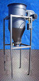 Stainless Steel Cyclone Filter/Dust Collector- 6.6 Cu. Ft. FMC Syntron model FV 8A, serial 160220 E, A-73696. Baldor Industrial Motor, 3 hp, 208-230/460 V, 8.1-7.6/3.8 amps, 3450 rpm, 60 Hz, 3 phase. Allen Bradley disconnect with Start and Stop switch. Inlets: (1) 4 in. dia port. Outlets: (1) 4 in. dia. port, 8 in. dia. discharge. Overall dimensions: 53 in. L x 32 in. W x 95-1/2 in. H.
