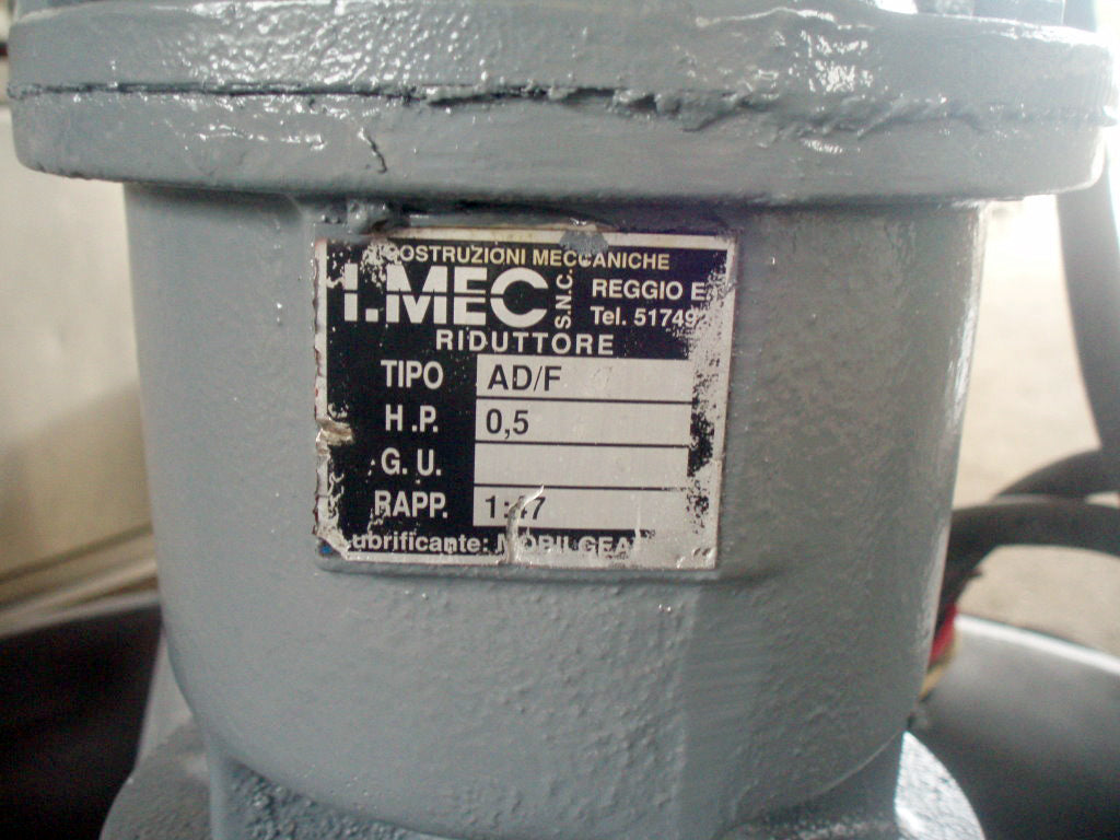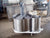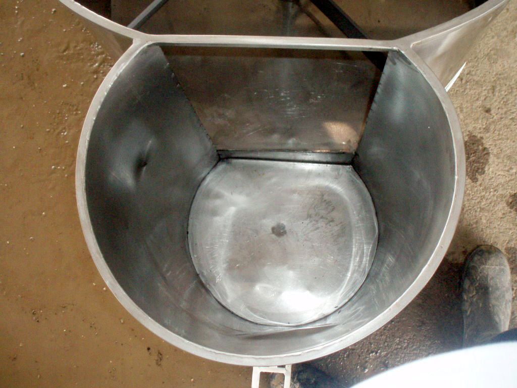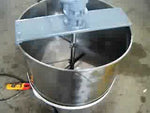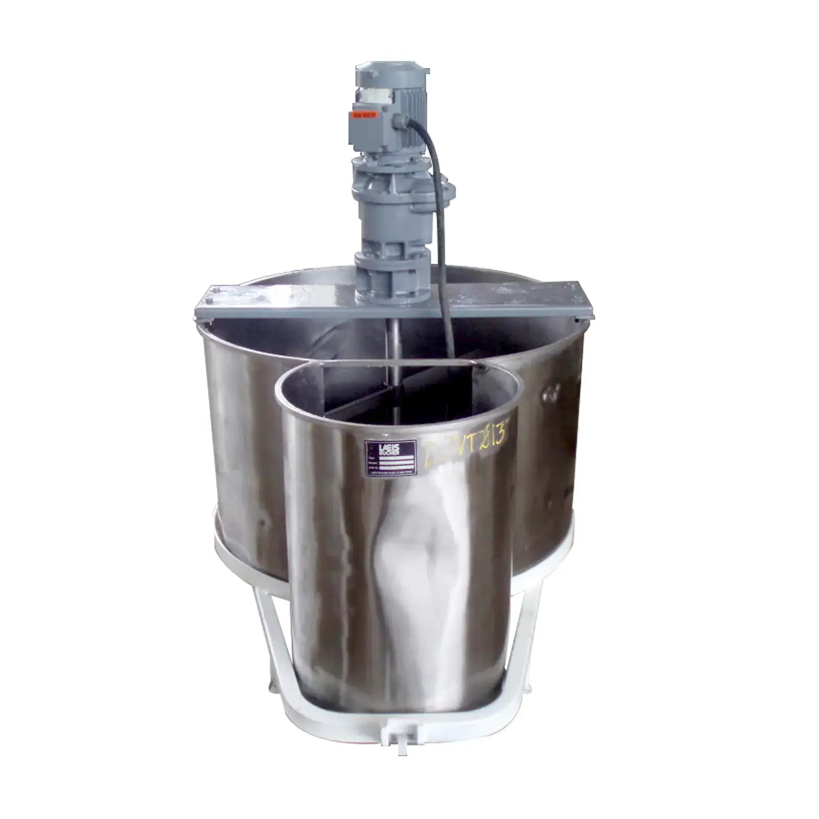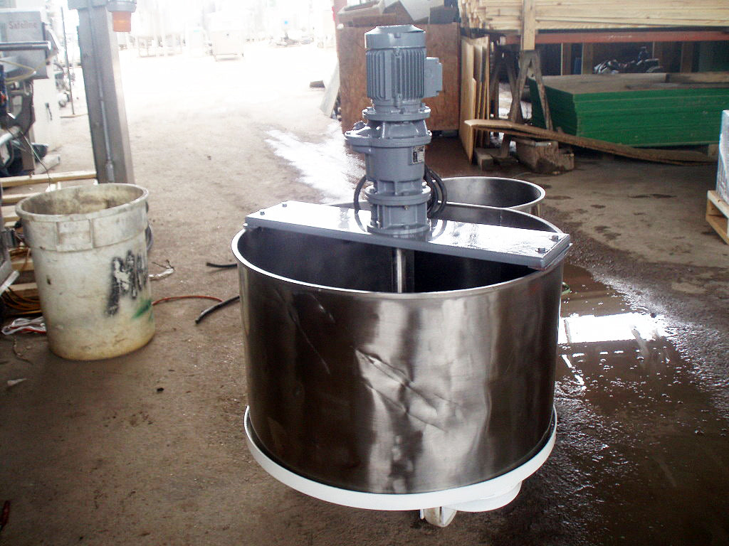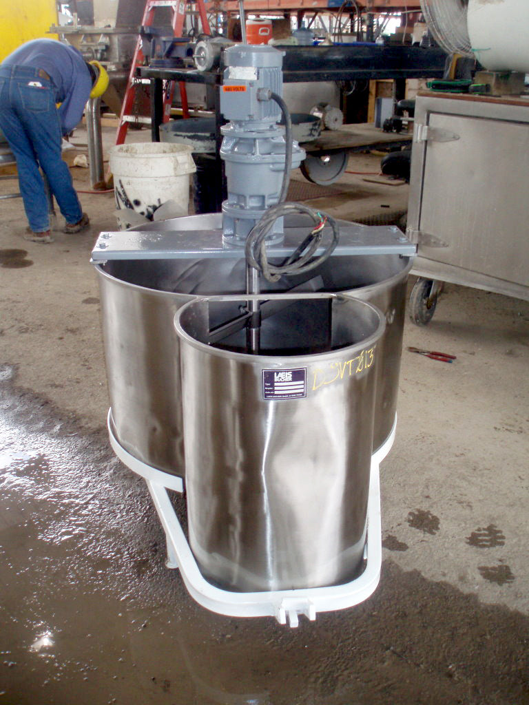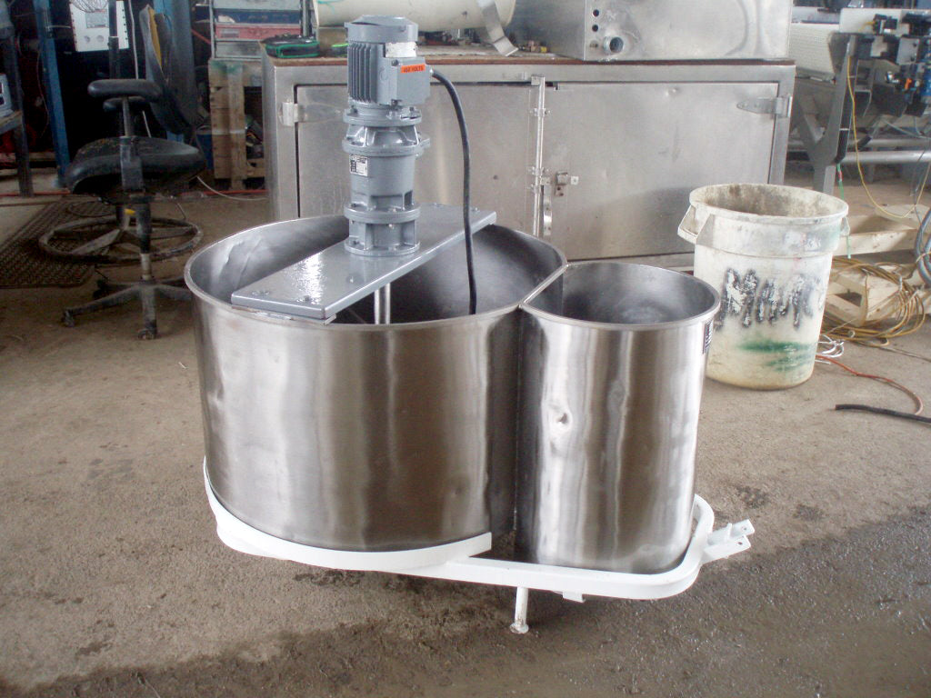 1996 Stainless Steel Double Tank with Mixer. Approximate combined capacity: 88.4 gallons. Ametric mixer motor, 0.5/0.6 hp (0.37/0.44 Kw), 1380/1655 rpm, 220-240/250-280 V, 2.0/2.1 amps, 60 Hz, 3 phase. IMEC motor drive, 1:47 ratio, 29.36/35.2 (final) rpm. Shaft dimensions: 1-1/2 in. diameter x 1 ft. 8 in. L. (2) Propellers: 2 ft. 5 in. L x 2 in. W. Tank section #1 dimensions: 32 in. dia. x 1 ft. 8 in. H; Tank section #2 dimensions: 15-1/2 in. diameter x 1 ft. 11 in. H. Outlet: 1 in. threaded mpt. located on tank section #2. Base: (2) wheels and (2) leg/supports. Overall dimensions: 4 ft. 2 in. L x 2 ft. 9 in. W x 3 ft. 11 in. H.