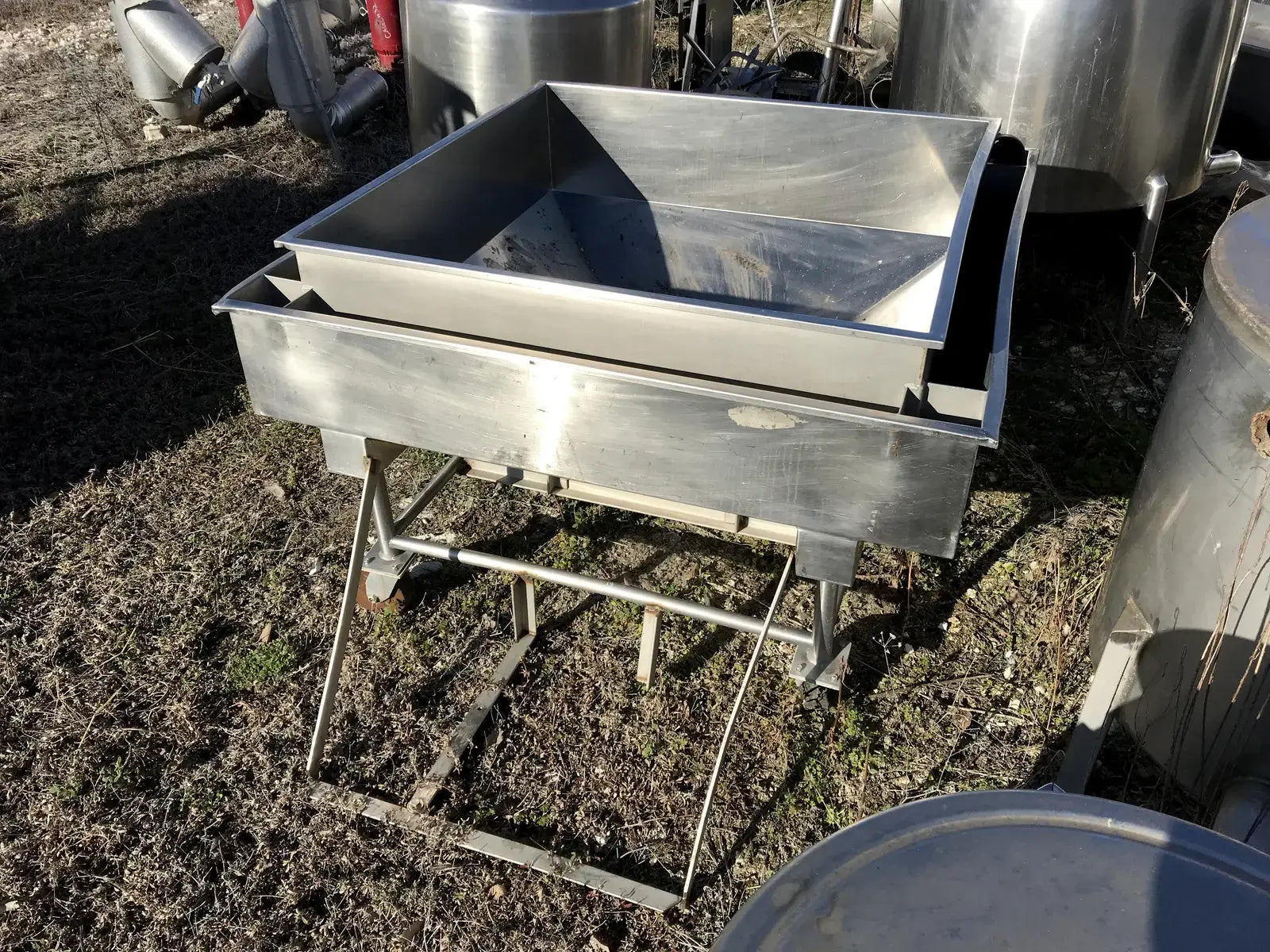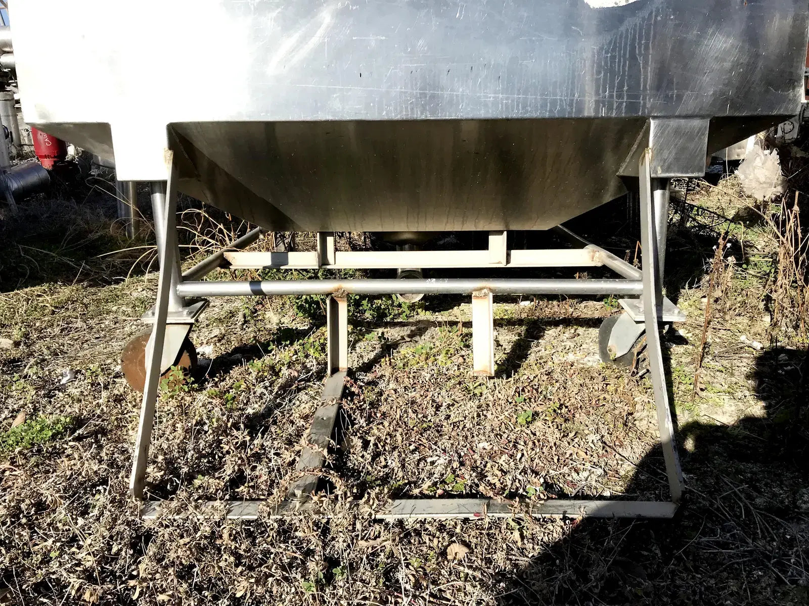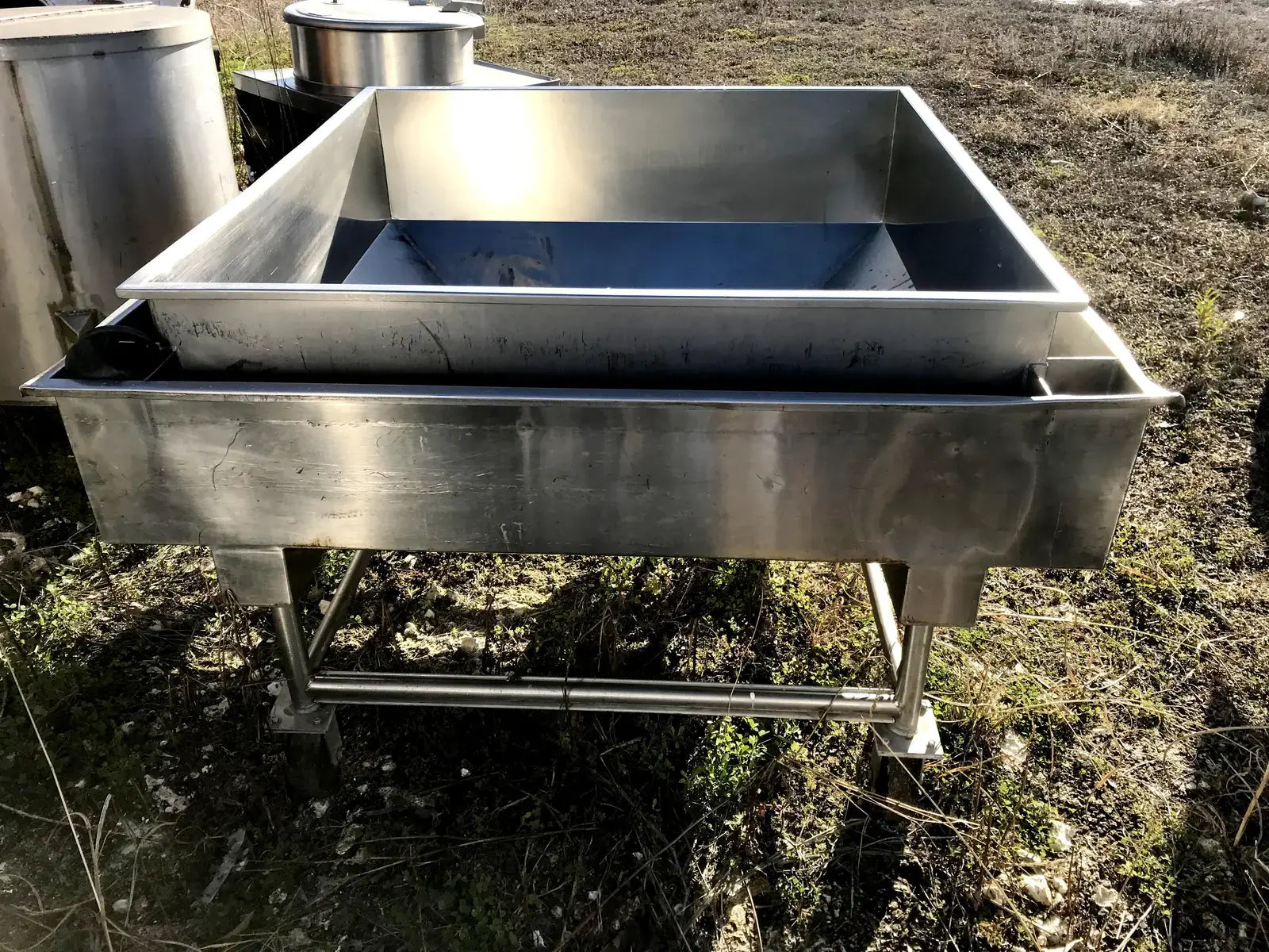 Stainless Steel Rectangular Tank with double wall. Interior dimensions: 47 in. x 47 in. x 12 in. H sidewall. Interior depth: 26 in. Main tank discharge: 3 in. tri-clamp. Double wall discharge ports: (2) 1 pipe thread. Gap between interior/exterior walls: approx. 4 in. Castor wheels: 4.