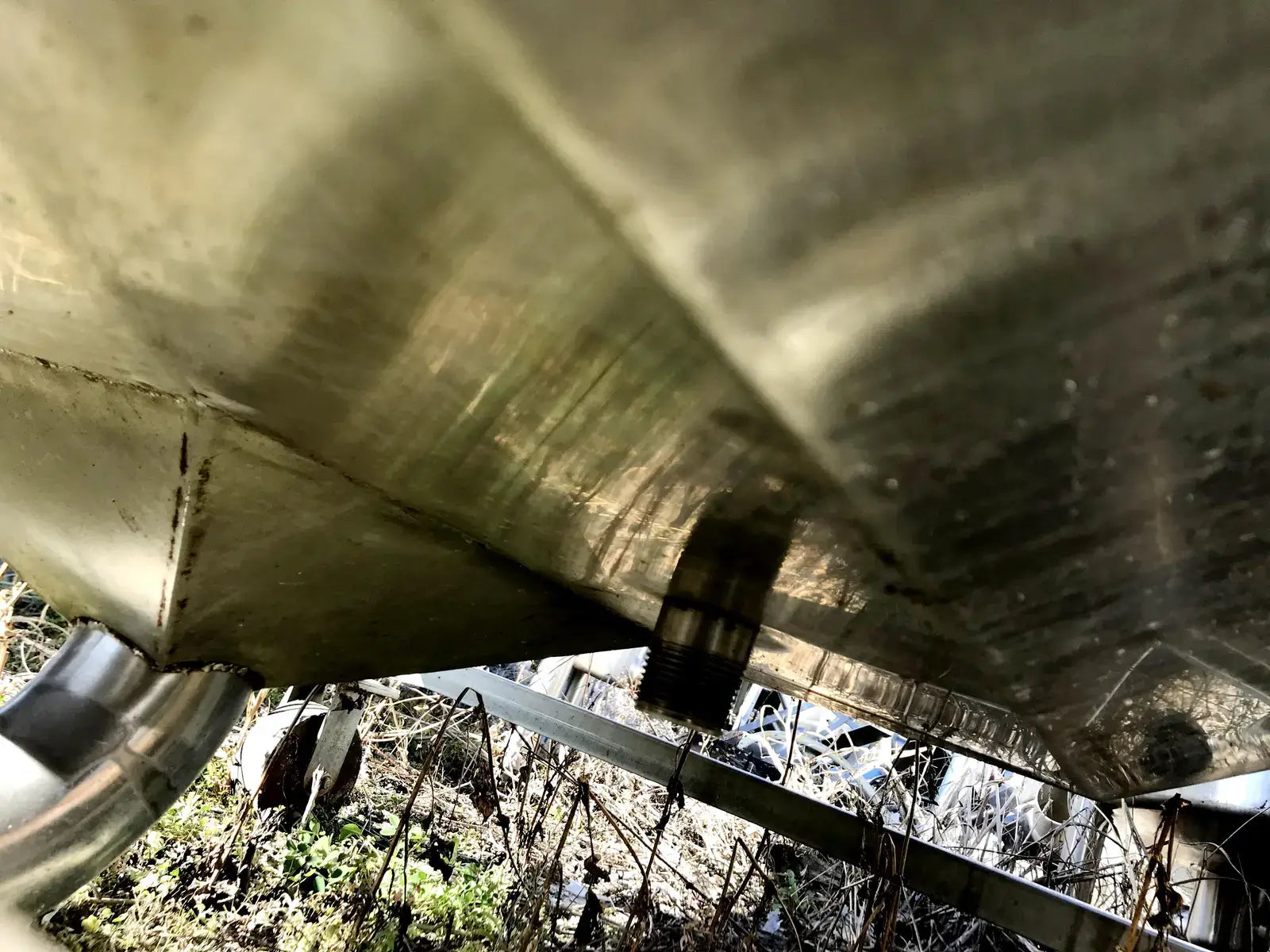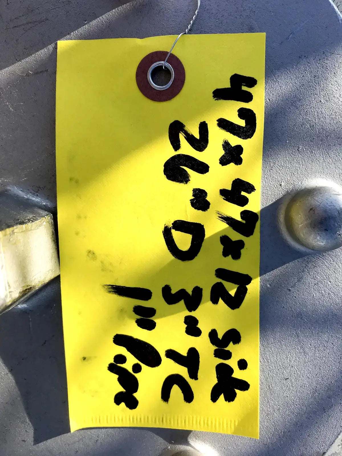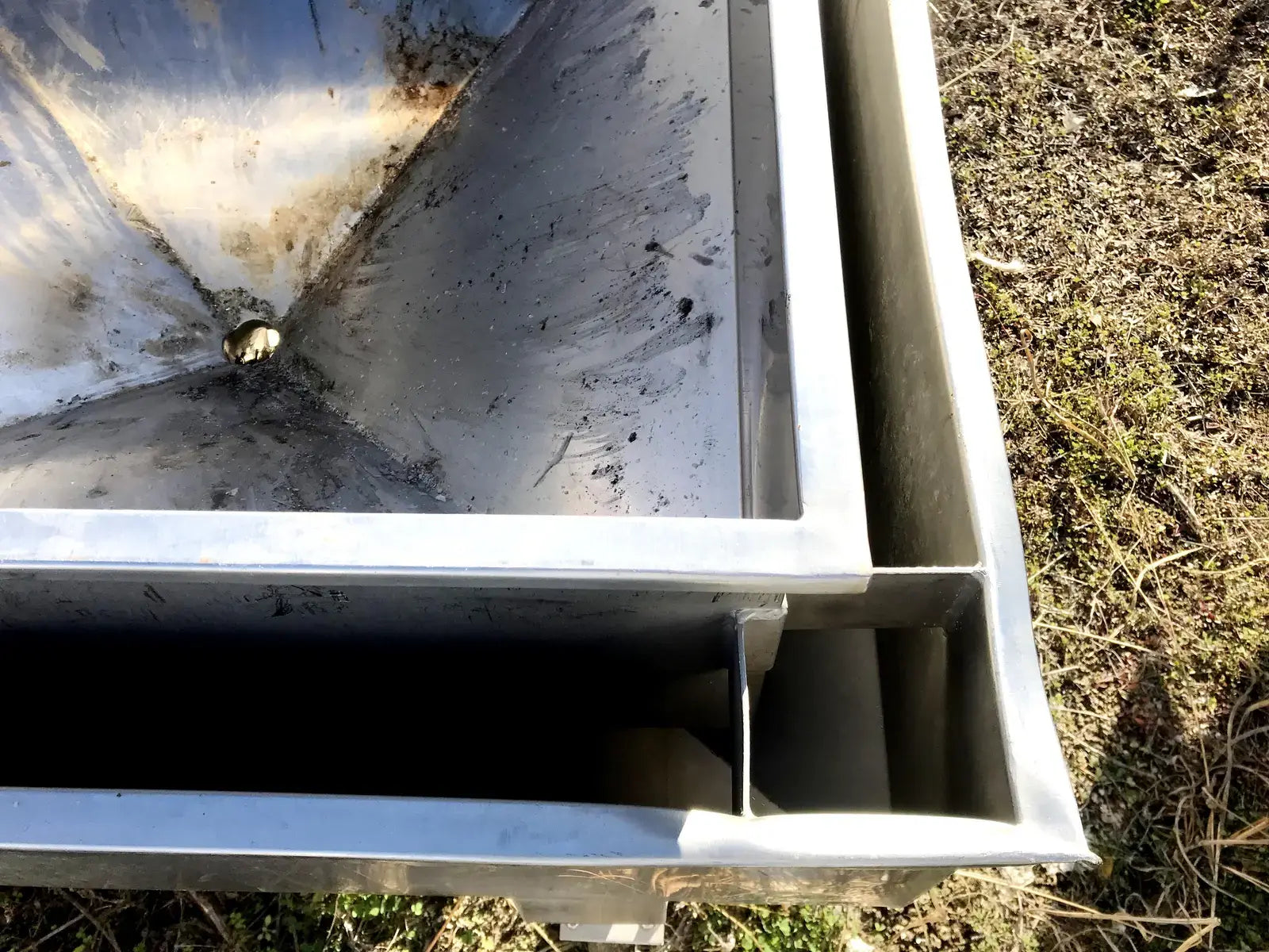 Stainless Steel Rectangular Tank with double wall. Interior dimensions: 47 in. x 47 in. x 12 in. H sidewall. Interior depth: 26 in. Main tank discharge: 3 in. tri-clamp. Double wall discharge ports: (2) 1 pipe thread. Gap between interior/exterior walls: approx. 4 in. Castor wheels: 4.