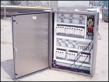 (3) Stainless Steel Electric Control Panel. Inside dimensions: 3 ft. 7 in. L x 8 in. W x 3 ft. 10 in. H. Power supply: 240 V, 5 amps, 60 Hz. Square-D circuit breaker, Catalog no: FAL32100, 240 volt, 3-pole, 100 amp, 50/60 Hz. Door mounted circuit breaker operating kit. Overall dimension: 3 ft. 11 in. L x 10 in. W x 4 ft. H.(H11)(ACN24a).