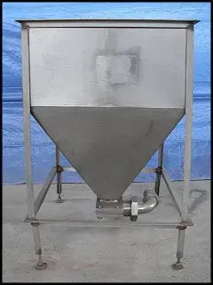 Stainless Steel Funnel Hopper. Approximate capacity: 40 gallons. Hopper opening: 28.5 in. x 23 in. Straight wall dimensions: 28.5 in. x 23 in. x 12 in. Hopper overall dimensions: 30 in. L x 24 in. W x 30 in. H. Hopper wall thickness: 0.065 in. Port on bottom of hopper is rectangular flange: 4 ½ in. x 15 ¼ in. with 2 ¾ in. x 8 ¼ in. opening. Currently attached to flange is an adapter with a 3 in. bevel seat outlet. Attached to adapter is a 3 in. to 2 in. bevel seat reducer and elbow followed by a 2 in. bevel seat to 2 in. S-line adapter. Overall dimensions: 2 ft. 7 in. L x 2 ft. 1 in. W x 3 ft. 2 in. H.