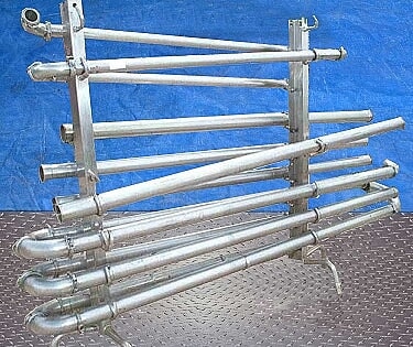 Stainless Steel Holding Tube, Model 61807, S/N H1804. Inlets 2 in., outlets 2 in.. Overall dimensions: Frame 52 in. L x 21 in. W x 62 in. H. (3) 63 in. L tubes, (11) 3 in. diameter x 82 in. L. tubes.