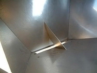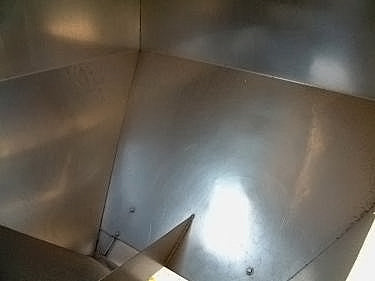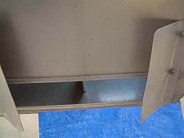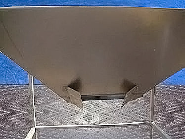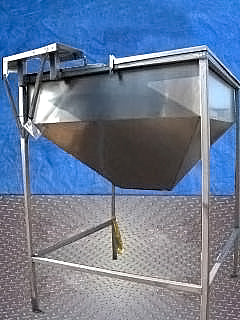 Stainless Steel Tank- 130 Gallon. Square tank with cone bottom. (2) flip top lids. Inside dimensions 48 in. L x 48 in. W. Equipped with (4) 54 in. high legs. Infeed height: 74 in. Exit height: 34 in. Outlets: 17 in. L x 3 in. W discharge. Overall dimensions: 60 in. L x 59-1/5 in W x 74 in H.