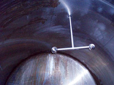 Stainless Steel Horizontal Jacketed Tank. Rated capacity: 3500 gallons. Percent cold wall: 50%. Dual sprayball. Agitator: 15 in. dia. Manway: 20 in. W x 16 in. H. Baldor Industrial Motor, 1-1/2 hp. Overall dimensions: 14 ft. 4 in. L x 9 ft. W x 9 ft. 6 in. H. (HB1).