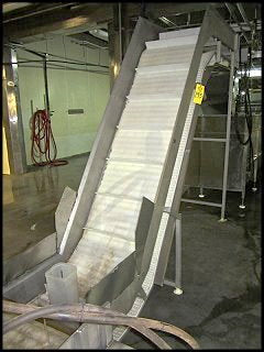 Stainless Steel Incline Z-Conveyor. 2 ft. W x 15 ft. L flighted intralox belt, 2 in. H flights, various spacing, 7 ft. discharge, drip pan, hydraulic drive