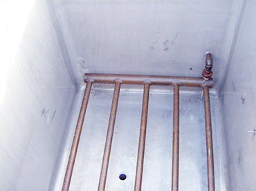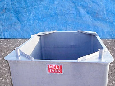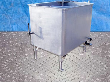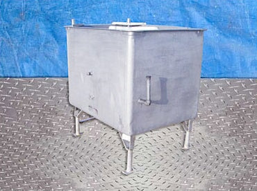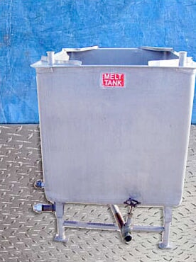 Stainless Steel Melt Tank. Approximate capacity: 460 gallons. Carbon steel steam coil overall dimensions: 3 ft. 10 in. L x 2 ft. x 9 in. W. Steam coil has a 2 in. header with 1 in. branches 6 in. apart. Inlet / outlet connections: (2) 1-1/2 in. Outlets, (1) 1 in. Inlet. (1) 1/2 in FNPT connection. Overall dim: 4 ft. 4 in. L x 3 ft. 3 in. W x 4 ft. 4 in. H.