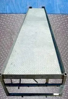 Stainless Steel Platform for Bulk Milk Tanks and Water Reservoir. Platform dimensions: 16 ft. 3 in. L x 35-1/2 in. W x 4 in. H. Tank capacity: 154 gallons (9 ft. L x 22 in. W x 15 in. H). Flotect switch, MWP: 100 psi (690 kPa). Inlets/outlets: (2) 1-1/2 in. copper lines:, (2) ¾ in. copper lines with insulation (2) 1-1/2 in. copper lines (tank middle). Overall dimensions: 205 in. L x 36 in. W x 55 in. H.