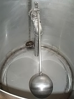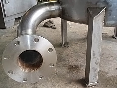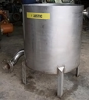 Stainless Steel Single Shell Balance Tank- 85 Gallon. Inside straight-wall dimensions: 2 ft. 7-1/2 in. dia. x 2 ft. 6 in. H. Liquid level float with cut-off valve. (4) 12 in. H. legs. Inlets: (1) 2 in. dia. port, (1) 1-1/2 in. dia. port. Outlets: (1) 4 in. dia. 150lb ANSI flanged port. Overall dimensions: 3 ft. 10 in. L x 2 ft. 9 in. W x 3 ft. 6-1/2 in. H.(H13).