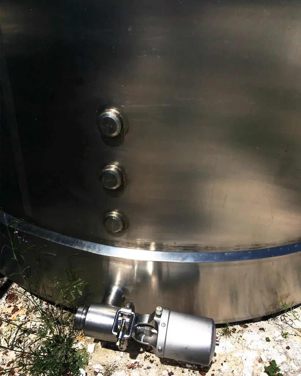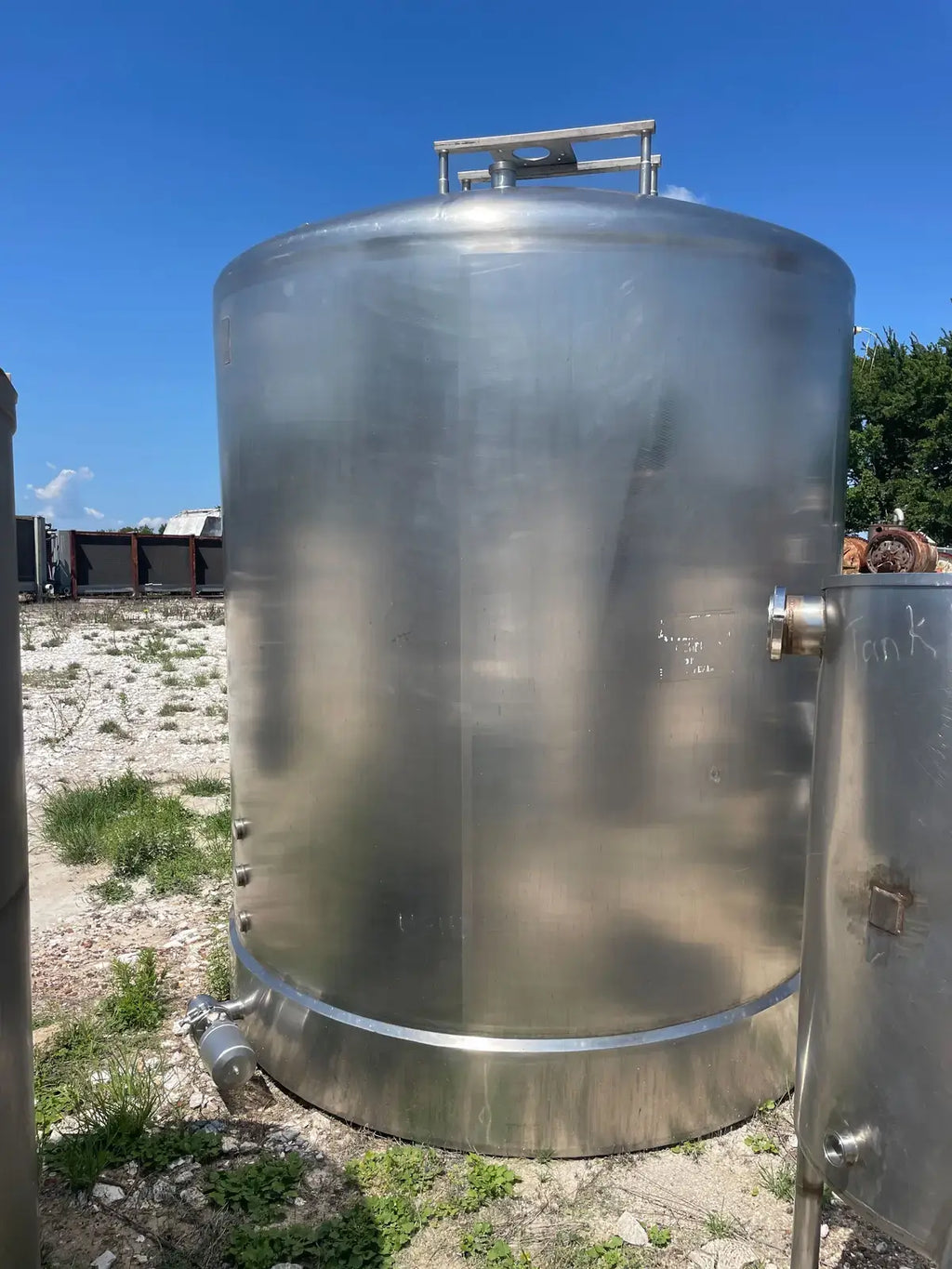 Stainless Steel Single Shell Tank-2,500 Gallon. 304 stainless steel construction. Wall thickness: 0.105 in. Inside straight wall dimensions: 7 ft. 1 in. dia. x 7 ft. 10 in. Manhole cover diameter: 18 in. Tank is equipped with a Cherry-Burrell pneumatic discharge valve. Product Outlet is 2.5 in. ACME thread with a 13 in. centerline height from ground. Inlets: (1) 3 in. dia. ACME fittings, (1) 2 in. dia. ACME fittings, (1) 2-1/2 in. dia. port. Outlets: (1) 1-1/2 in. dia. port, (1) 2-1/2 in. dia. ACME port. Overall dimensions: 88 in. dia. x 9 ft. 8 in. H.