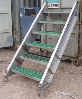 Stainless Steel Stairway. (6) 2 ft. 7-1/2 in. L x 10 in. W steps. Final height: 4 ft. 6-1/2 in. Distance between steps: 9-1/2 in. Overall dimensions: 36 in. L x 11-3/4 in. W x 88 in. H.