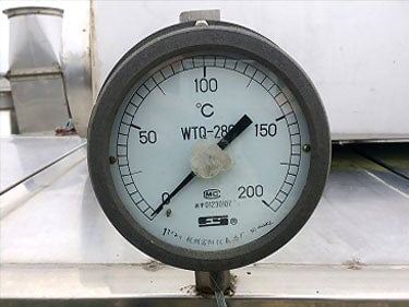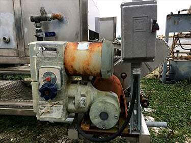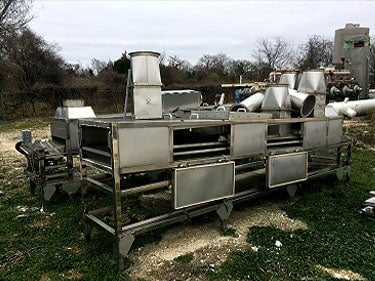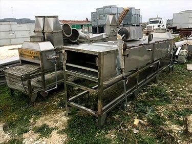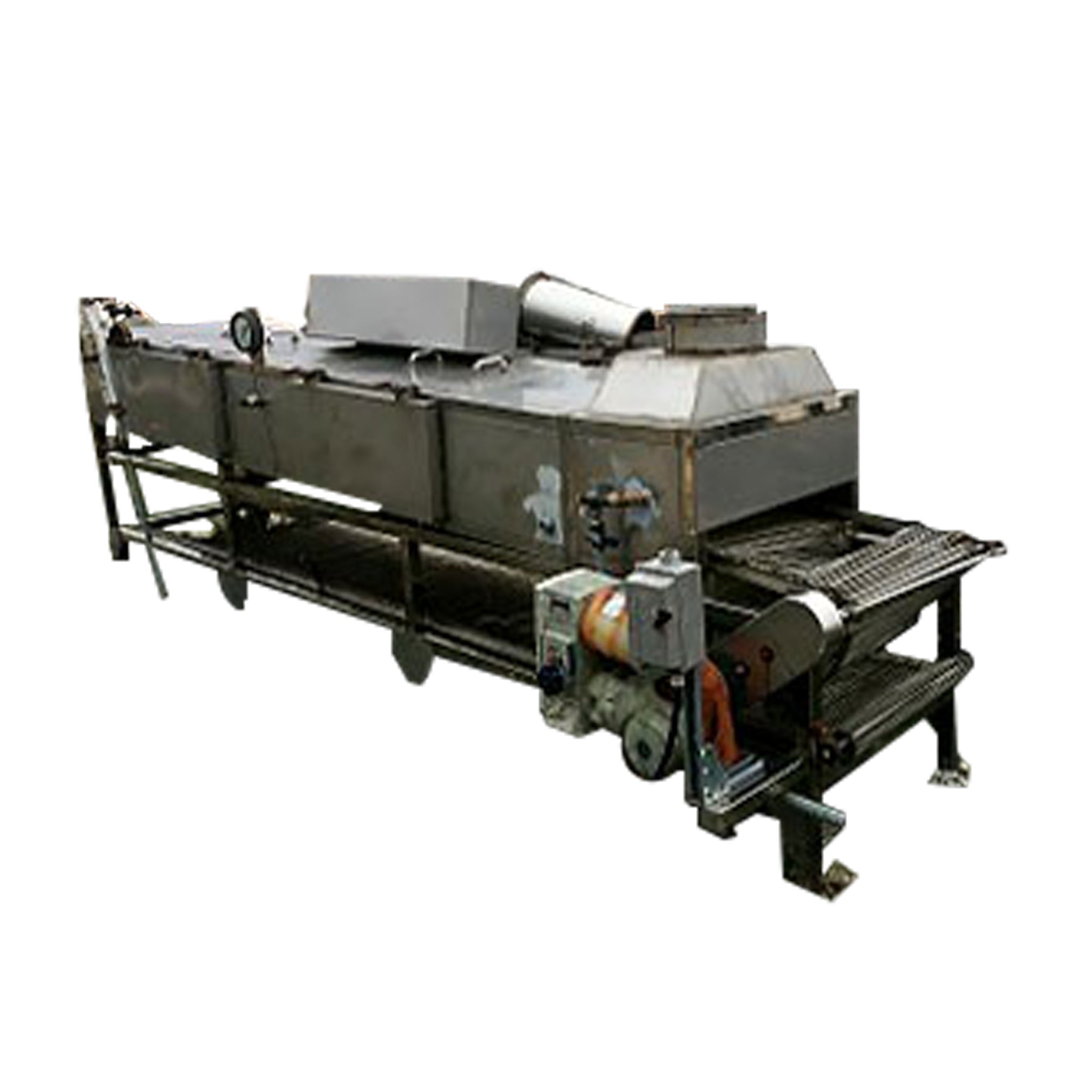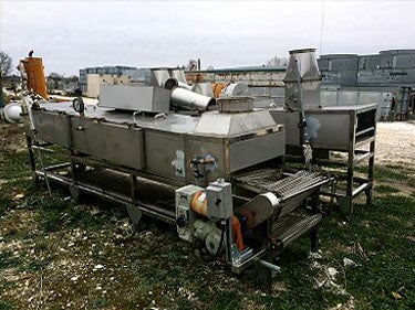 1998 Stainless Steel Steam Tunnel Oven. Markings on nameplate appear to be Asian. Belt Width: 24 in. Belt gap: 0.5 in. Product height clearance: 2.75 in. Interior length: 26 feet. Steam injection via piping beneath the belt. Insulated side panels with 33.5 in. x 15.5 in. access doors. Top access panels 27.5 in. x 31 in. Round vent discharge connections at each end. U.S. Motors Unimount 125 model E186 1 HP motor, 1,745 RPM, 208-230/460V, 3-phase, 60 Hz. U.S. Motors Varidrive gear box in U.S. Motors Syncrogear module. Gear-drive: 7.5 to 75 final RPM. Features a belt tensioning devise. Temperature gauge reads up to 200 Celsius. Unit separates into two pieces for transportation. Overall length: 30 feet. Overall Dimensions (two sections): (A): 176 in. L x 45 in. W x 57 in. H. (B): 176 in. L x 58 in. W x 57 in H.