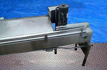 Stainless Steel Table Top Conveyor with Work Table. Unit features a 120 in. L x 21 in. W work table. Sprocket diameter of 1-5/8 in. and a 3/4 in. pitch. Infeed height 34.5 in. Max product width 3.5 in. Baldor Industrial Motor Model: CDP3436, 75 hp, 1750 rpm, 180 volts, 3.7 amps. Gear Box Ratio 30, Torque 691 in./lbs. Hoffman Electric Box. Model: A-10086CH. (2) power outlets. Overall Dimension: 146 in. L x 29.5 in. W x 45.5 in. H.