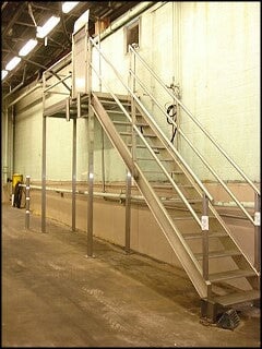 Stainless Steel Tanker Unloading Platform and Stairway. Stair dimensions: 8 ft. 5 in. L x 3 ft. X W x 2 ft. 10 in. H. Space between steps: 7 in. Retractable wing dimensions: 5 ft. 4 in. L x 2 ft. 6 In. (4) Leg dimensions: 5 in. L x 4 in. W x 10 ft. 4 in. H. Platform overall dimensions: 9 ft. 11 in. L x 3 ft. 8 in. W x 13 ft. 9 in. H.