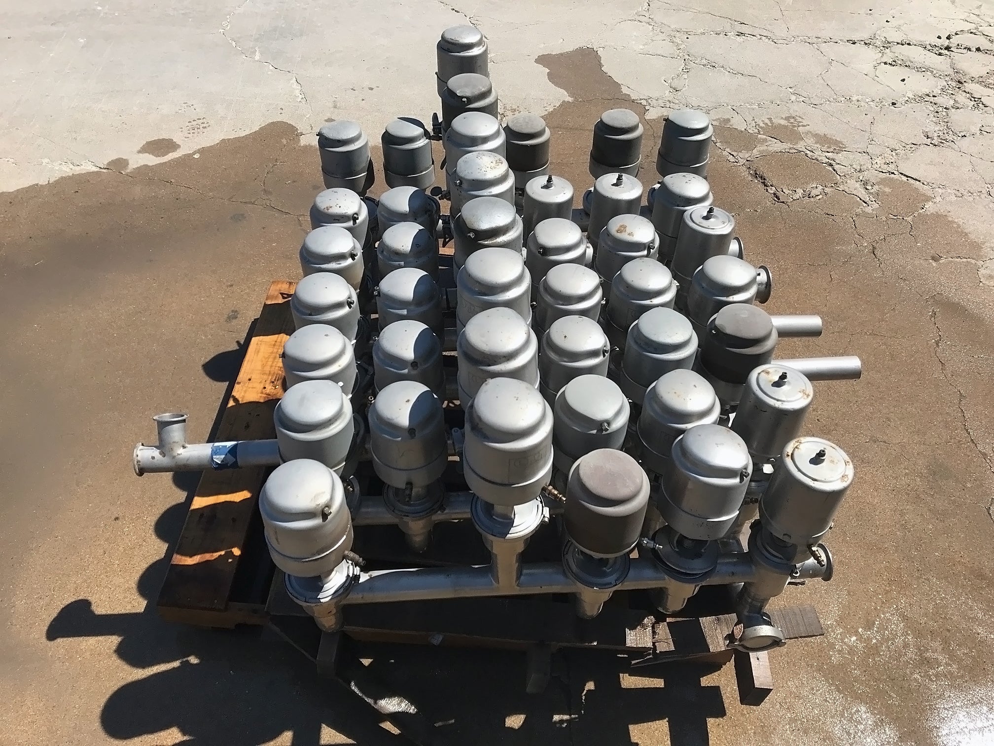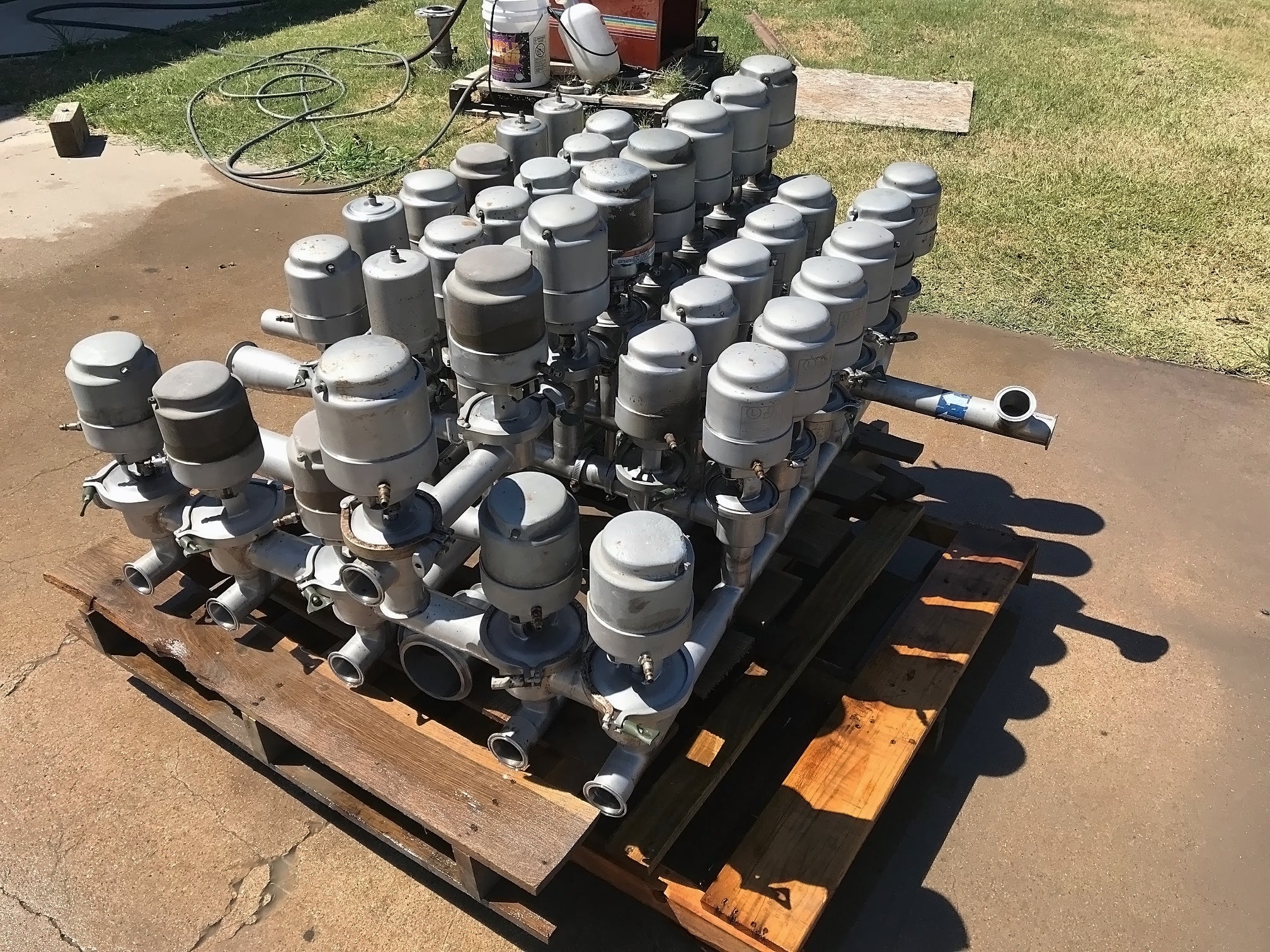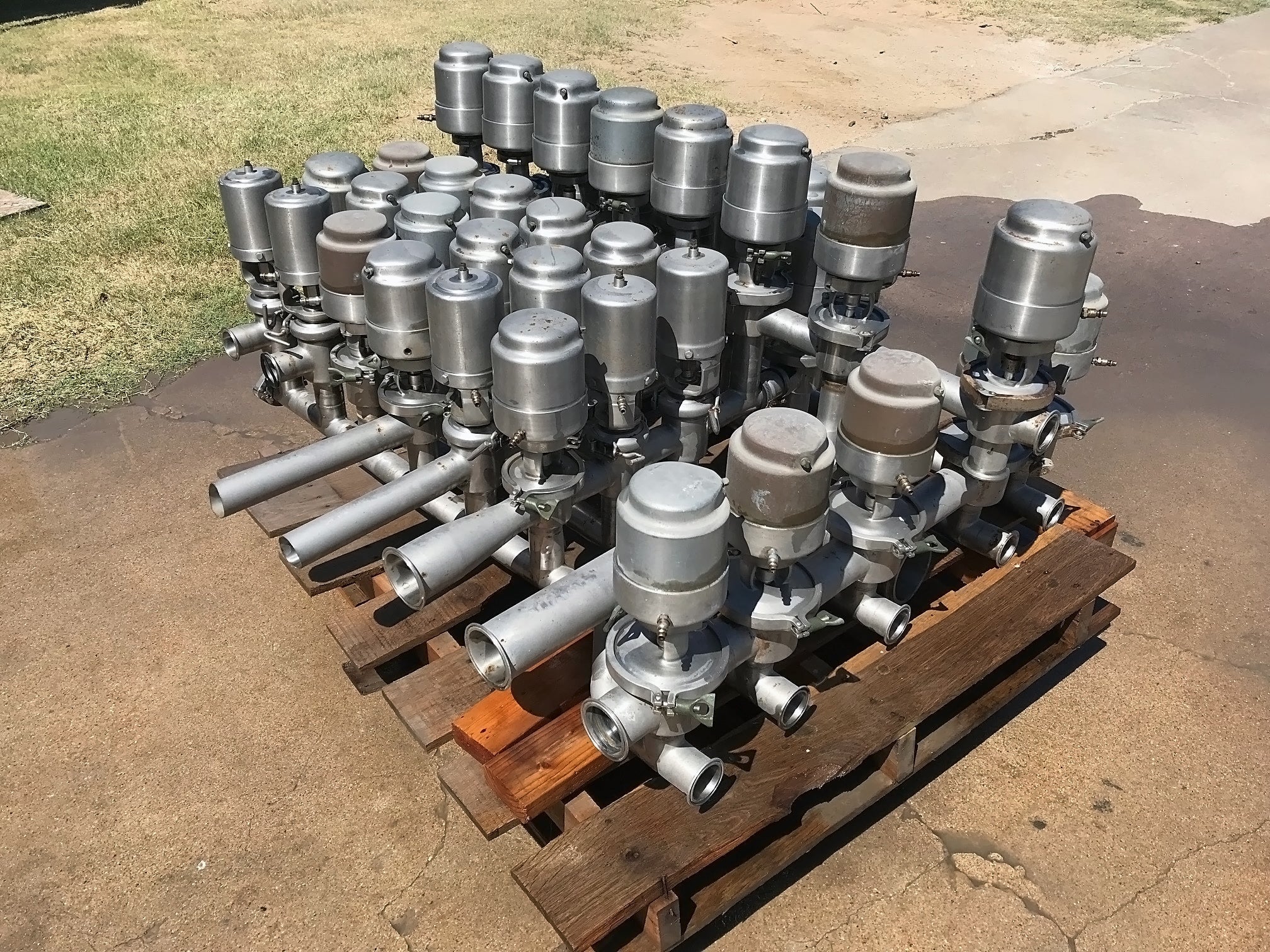 Used Stainless Steel Tri-Flo Pneumatic Valve Cluster. Tri-flo Ladish, a division of Tri-Clover. (5) valves 2.5 in. x 2 in., (37) valves 2 in. x 2 in. Total valves: 42.