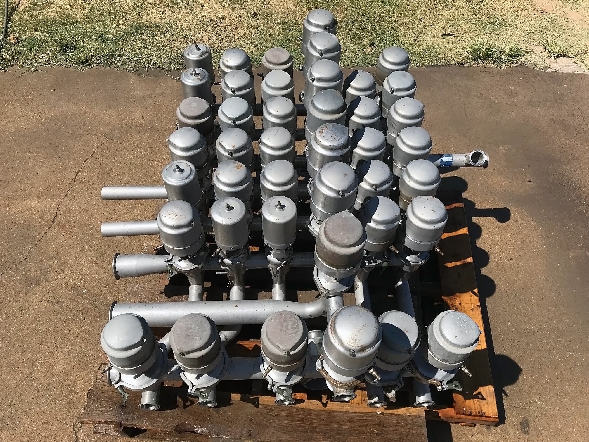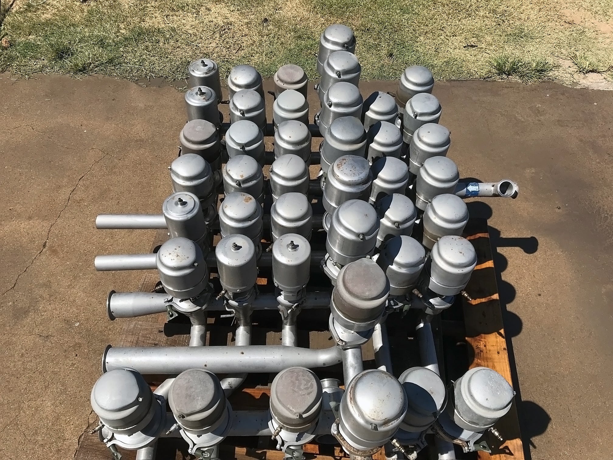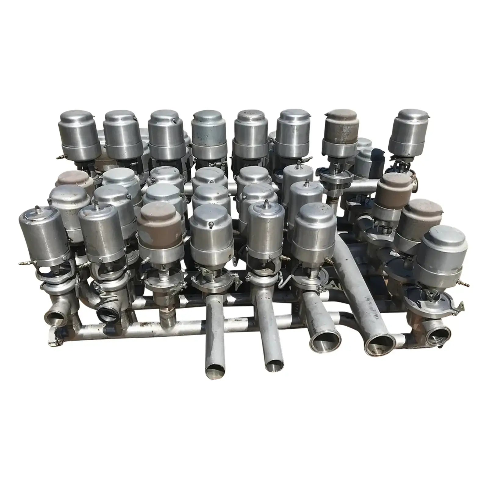 Used Stainless Steel Tri-Flo Pneumatic Valve Cluster. Tri-flo Ladish, a division of Tri-Clover. (5) valves 2.5 in. x 2 in., (37) valves 2 in. x 2 in. Total valves: 42.