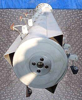 Stainless Steel Two Barrel Scrape Surface Heat Exchanger . (2) 15 in. dia. x 10 ft. 10 L barrels with (42) 1 in. L x 3 in. W bakelite scrapers. Setup for chilling with freon. (2) Erole Marelli Motors, 30 hp, 1507 rpm, 265/460 V 9.5/5.5 amps, 60 hz. ratio 10.4, final rpm: 163. Inlets: (2) 1-1/2 in. dia. NPT (male), (1) 2 in. dia. media port. Outlets: (2) 1-1/2 in. dia. NPT (male). Overall dimensions: 13 ft. 7 in. L x 24 in. W x 66 in. H