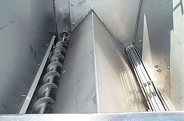 Stein Breader Breading Applicator. Model: L-6. S/N: 307. Baldor motor, 3 hp, 1760 rpm, 230/460 V, 8.2/4.1 amps, 60 Hz, 3 phase. (2) Motor drives. Blower motor: Reliance Electric, 1/3 hp, 3450 rpm, 208-230/460 V, 1.8-1.8/0.9 amps, 60 Hz, 3 phase. Transporter screw: 47 in. L x 6 in. diameter. Feeder screw: 60 in. L x 6 in. diameter. Container dimensions: 29 in. L x 20 in. W. with division in the middle. Belt dimensions: 37 in. L x 36 in. W. Final belt: 39 in. H x 30 in. W. Outlet belt: 36 in. H. Control panel: (4) switches, start/stop. Overall dimensions: 93 in. L x 50 in. W x 85 in. H.