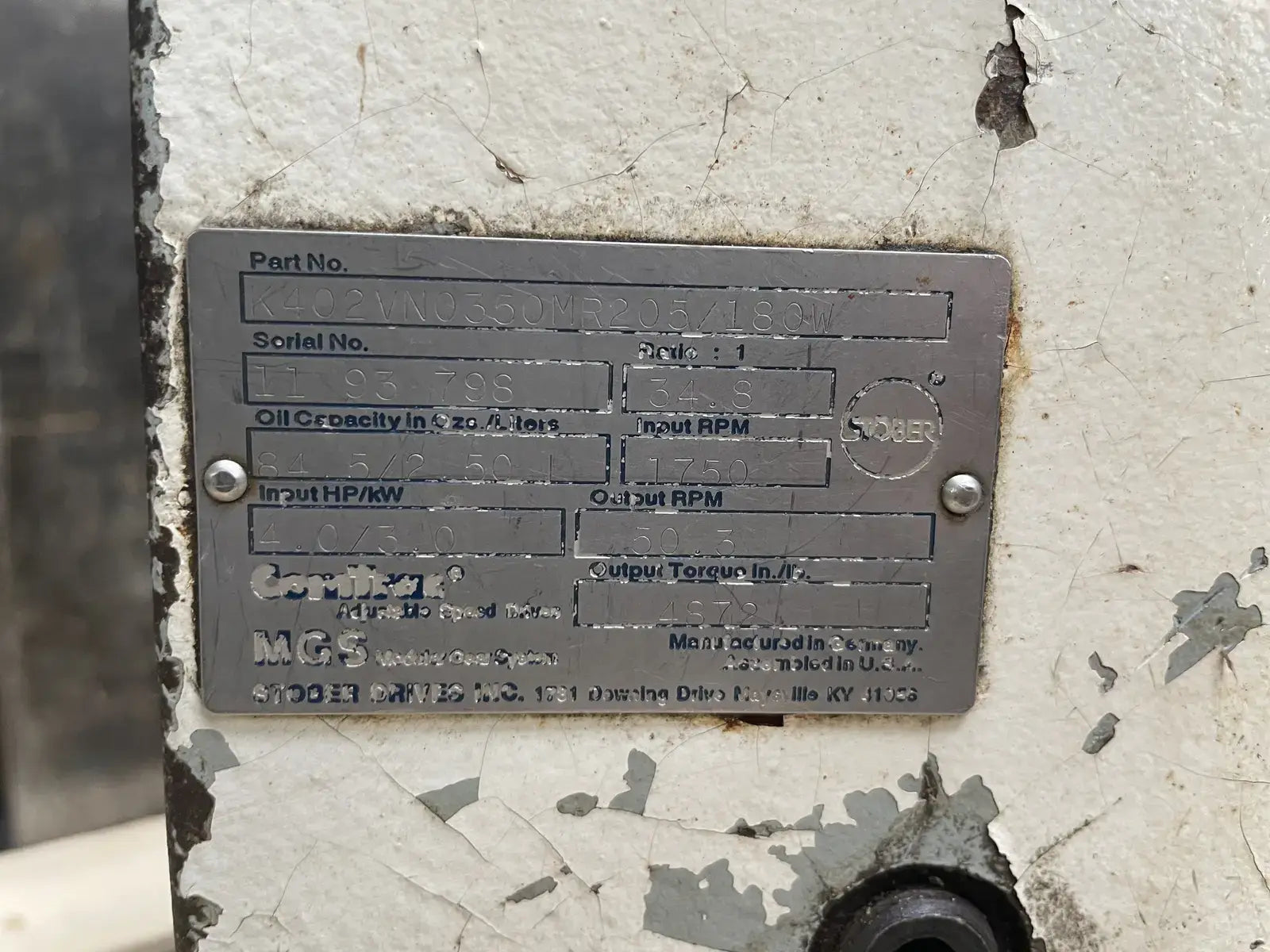 Stober Drives Inc K Series Right Angle Geat Drive. Part No: K402VN0350MR205/180W. Serial No: 11 93 798. Ratio: 34.8:1. Input RPM: 1750. InputHP/kW: 4.0/3.0. Output RPM: 50.3.