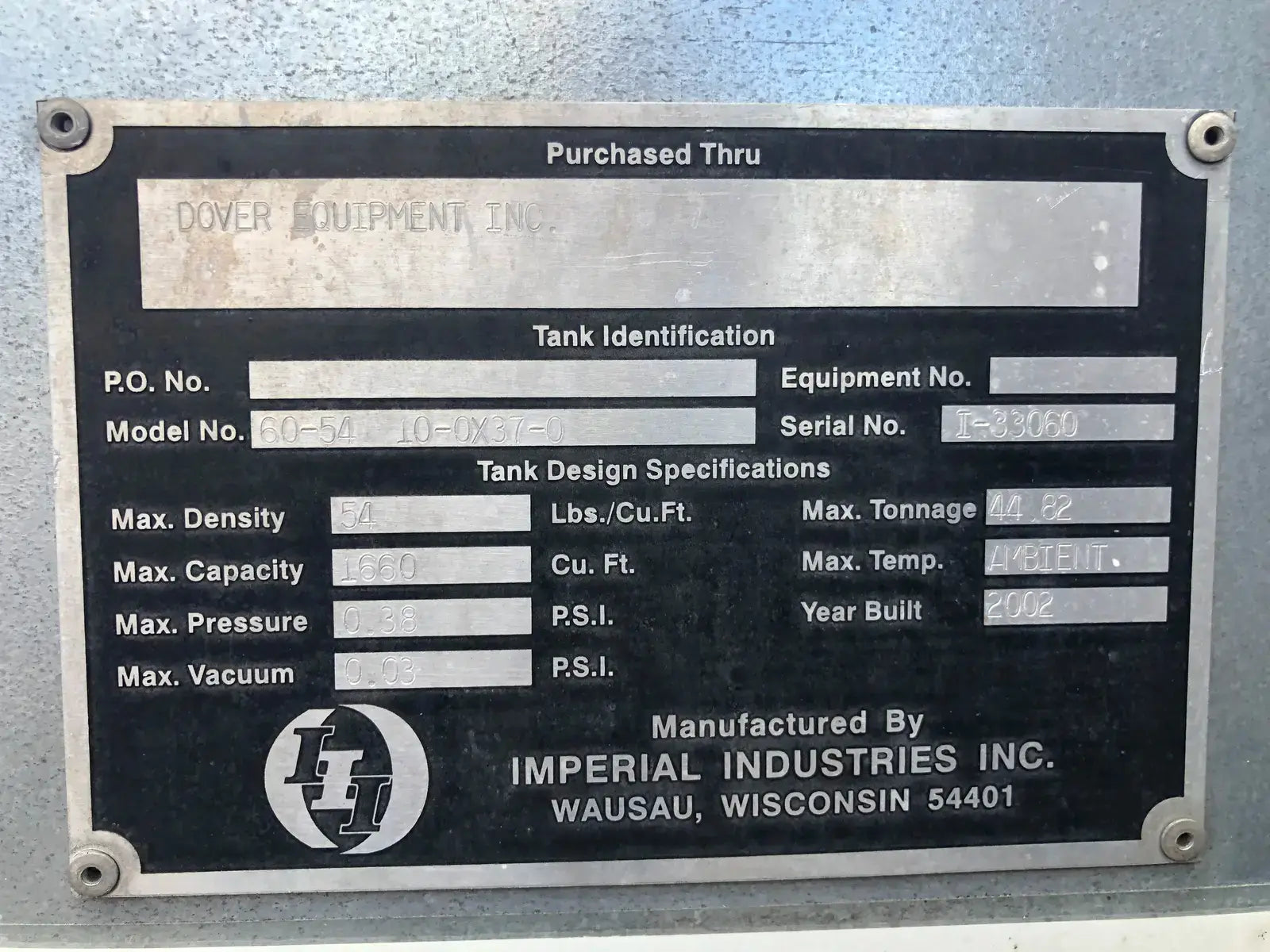 Manufacturer: Imperial Industries Inc. Model: 60-54 10-0X37-0, Serial: I-33060, Year Built: 2002, Max Density: 54 LBS/Cu.Ft., Max Tonnage: 44.82, Max Capacity: 1,660 Cu.Ft., Max Temp: AMBIENT, Max Pressure: 0.38 PSI, Max Vacuum: 0.03 PSI.