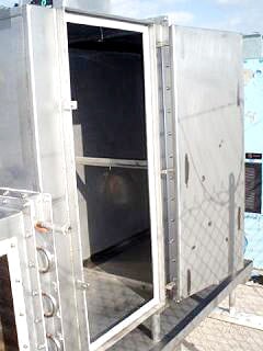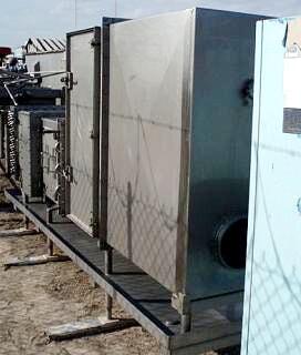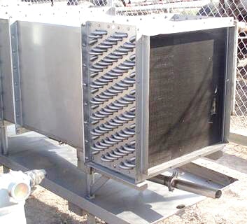 1997 Super Radiator Coils / C.E. Rogers Stainless Steel Plate / Fin Heat Exchanger. 304L Stainless Steel Tubes and Fins. Super Radiator Coils Steam Coil. S/N: M61294-1-001. (8) ½ in. dia. x 24 in. L 304L Stainless Steel Tubes. Heat Transfer Surface Area: 2.1sq. ft. C.E. Rogers Cold Air Duct and filter chamber. (160) ½ in. dia. x 24 in. L 304L Stainless Steel Tubes. Heat transfer surface area: 41.87 ft. sq. Inlets: (5) 2 in. dia. S-line, (1) 9 in. dia. port. Outlets: (4) 2 in. dia. ports. Overall dimensions: 12 ft. 3 in. L x 4 ft. 9 in. W x 6 ft. H. (ACN270). (BC).