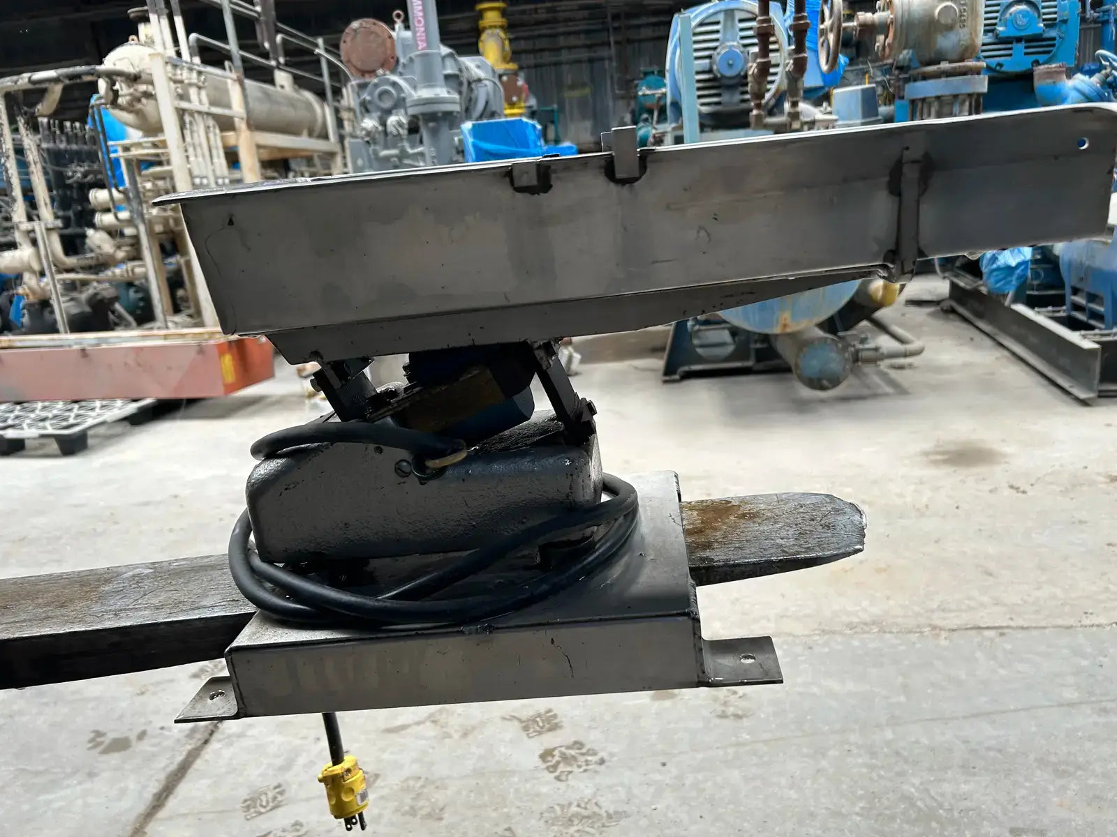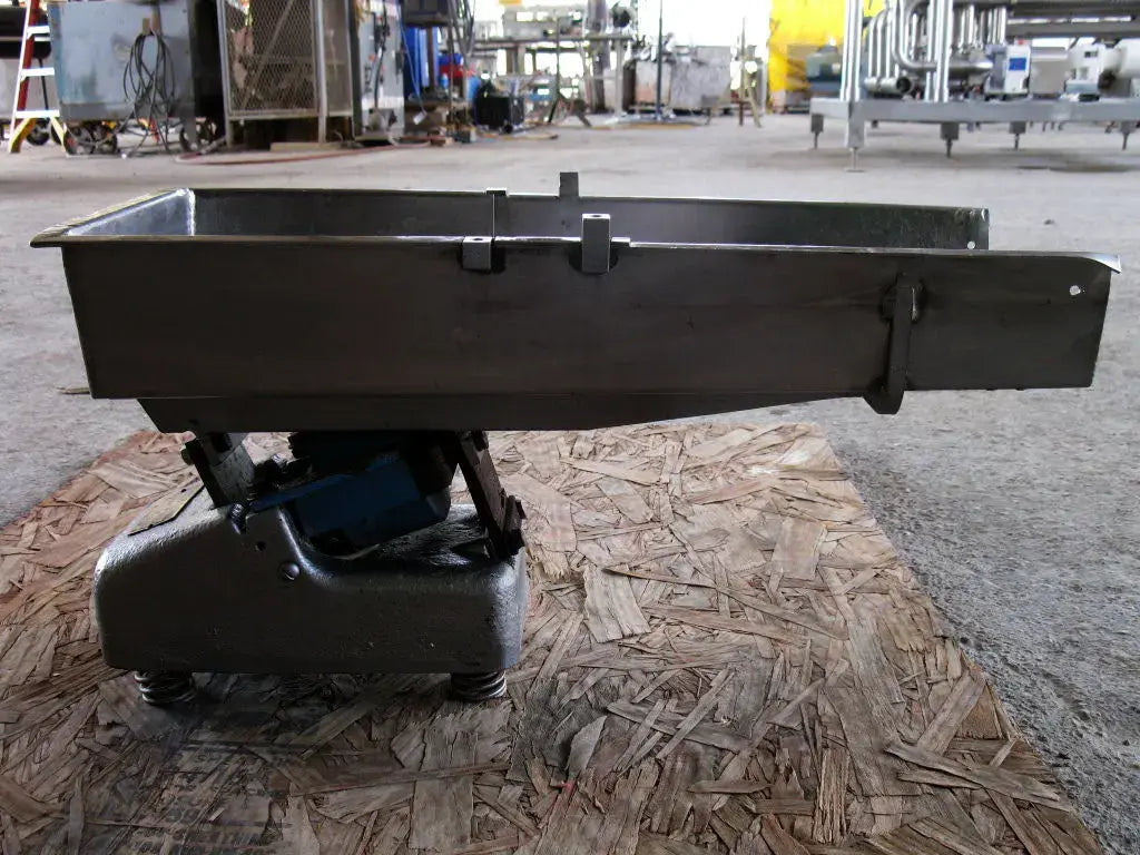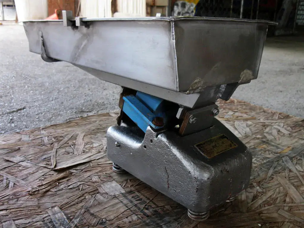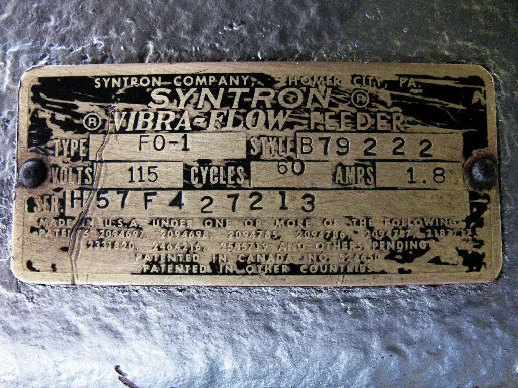 Syntron Vibra-Flow Vibrating Feeder. Model: F0-1. S/N: H57F427213. Style: B79222. Feed dimensions: 20-1/4 in. L x 8 in. W x 2 in. H. Front-left portion of feed: 12 in. L x 5 in. W x 3 in. H. Power supply: 115 V, 1.8 amps, 60 Hz. Overall dimensions: 22 in. L x 9 in. W x 11-1/4 in. H.