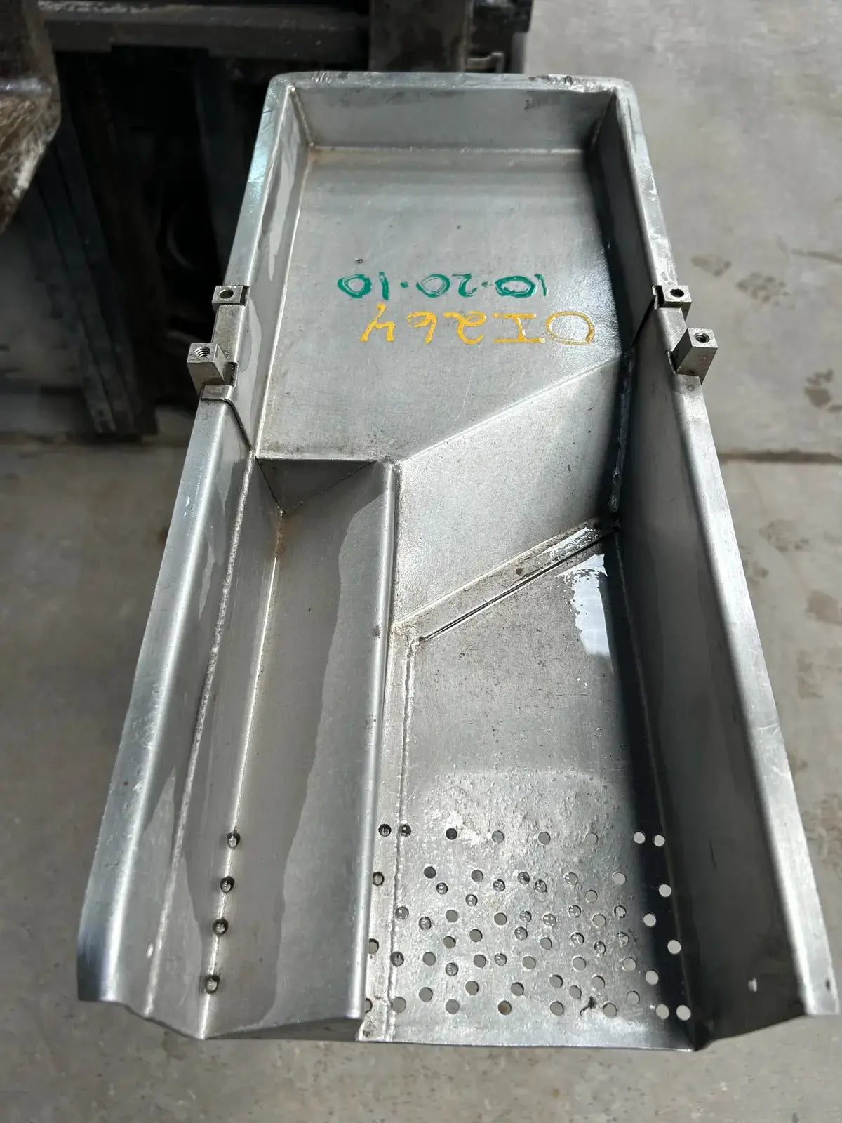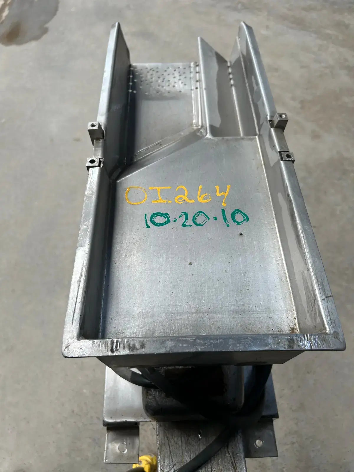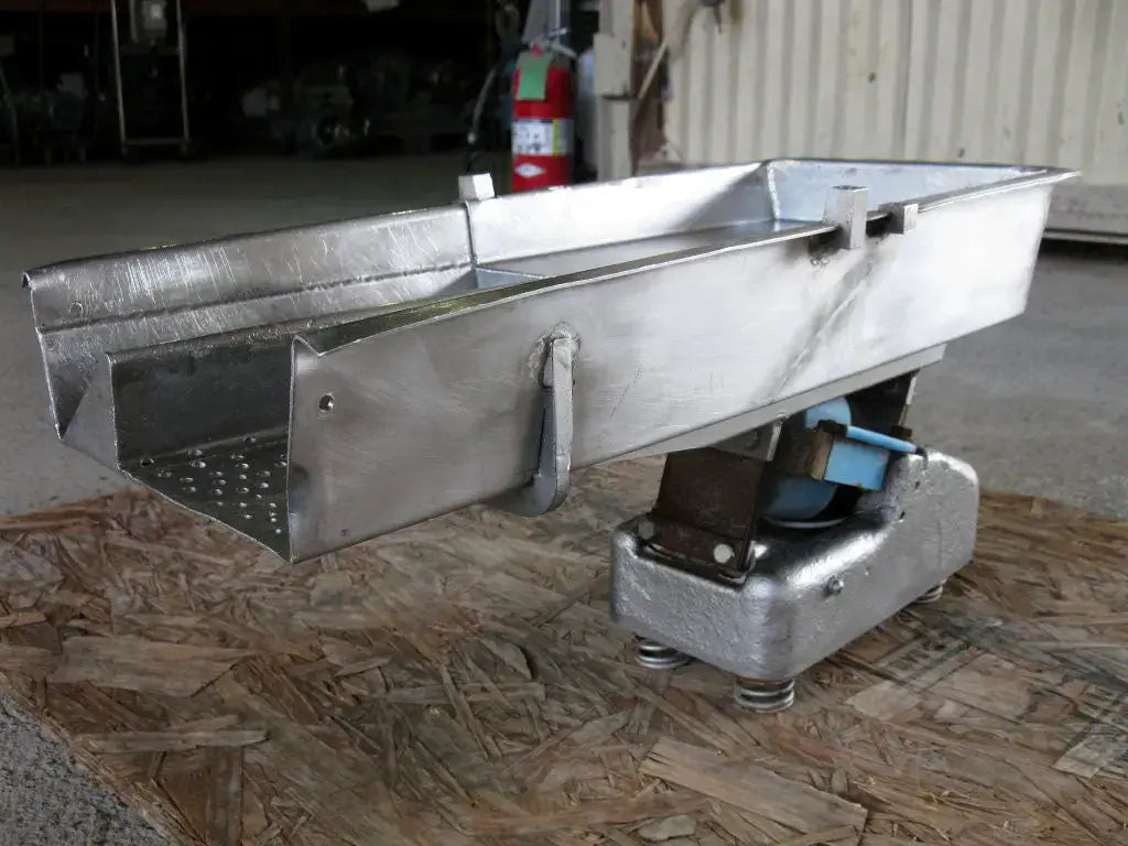 Syntron Vibra-Flow Vibrating Feeder. Model: F0-1. S/N: H57F427213. Style: B79222. Feed dimensions: 20-1/4 in. L x 8 in. W x 2 in. H. Front-left portion of feed: 12 in. L x 5 in. W x 3 in. H. Power supply: 115 V, 1.8 amps, 60 Hz. Overall dimensions: 22 in. L x 9 in. W x 11-1/4 in. H.