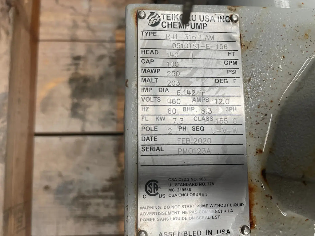 Teikoku USA Inc Refrigeration Canned Pump. Model: R41-316F4AM-0510TS1-E-156. Serial No:PM0123A. Capacity: 100 GPM. MAWP: 250 PSI. Impeller Size: 6.142 in. Power Output: 460Volt/12Amps/60Hz/3Ph/9.7 Hp.
