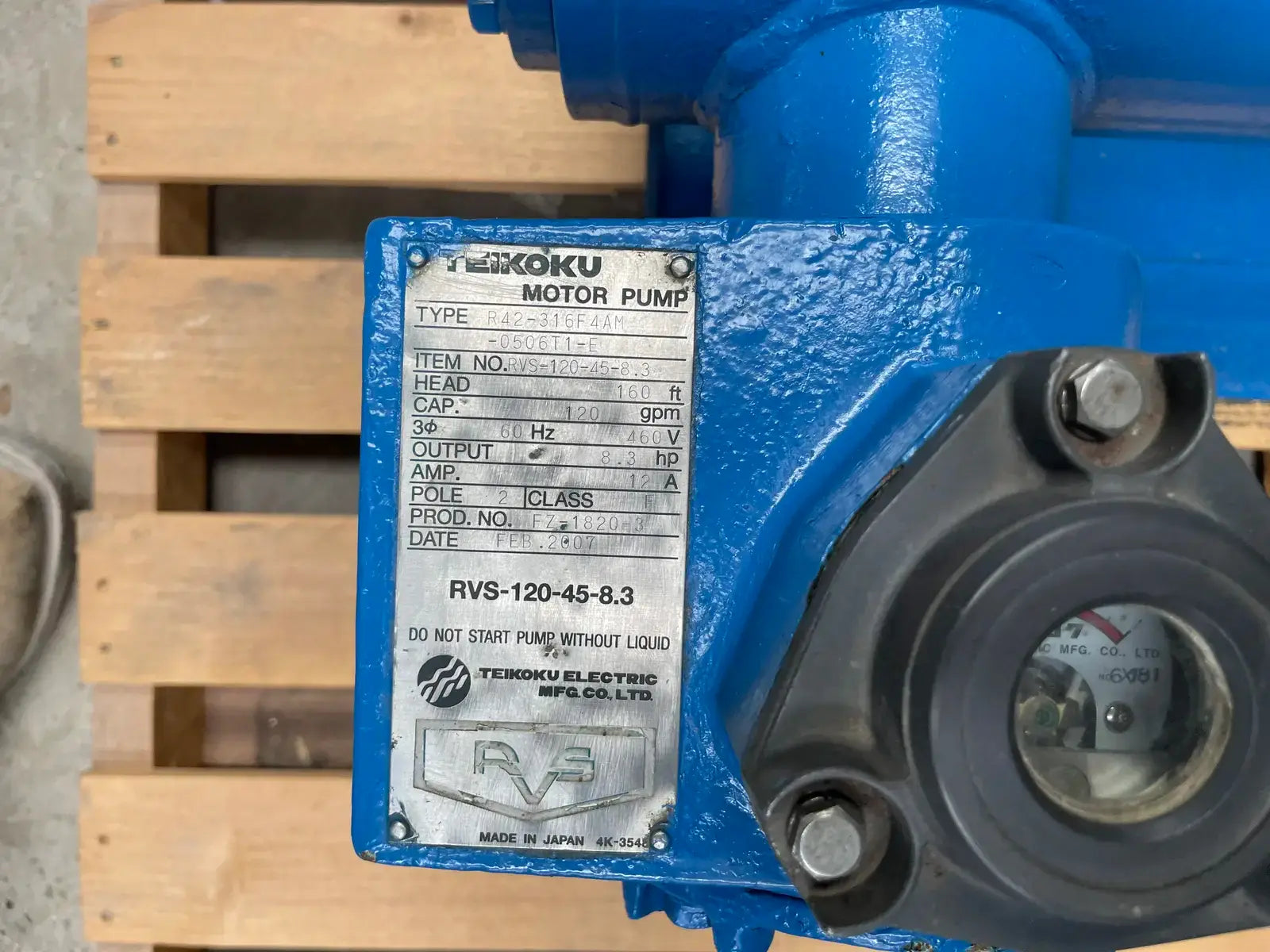 Teikoku Refrigeration Centrifugal Pump. Model: R42-316F4AM-0506T1-E. Serial No: FZ-1820-3. GPM: 120. Pump Size: 2x2.5x8. Hp Output: 8.3. Power Supply: 460V/3Ph/60Hz/12Amps.