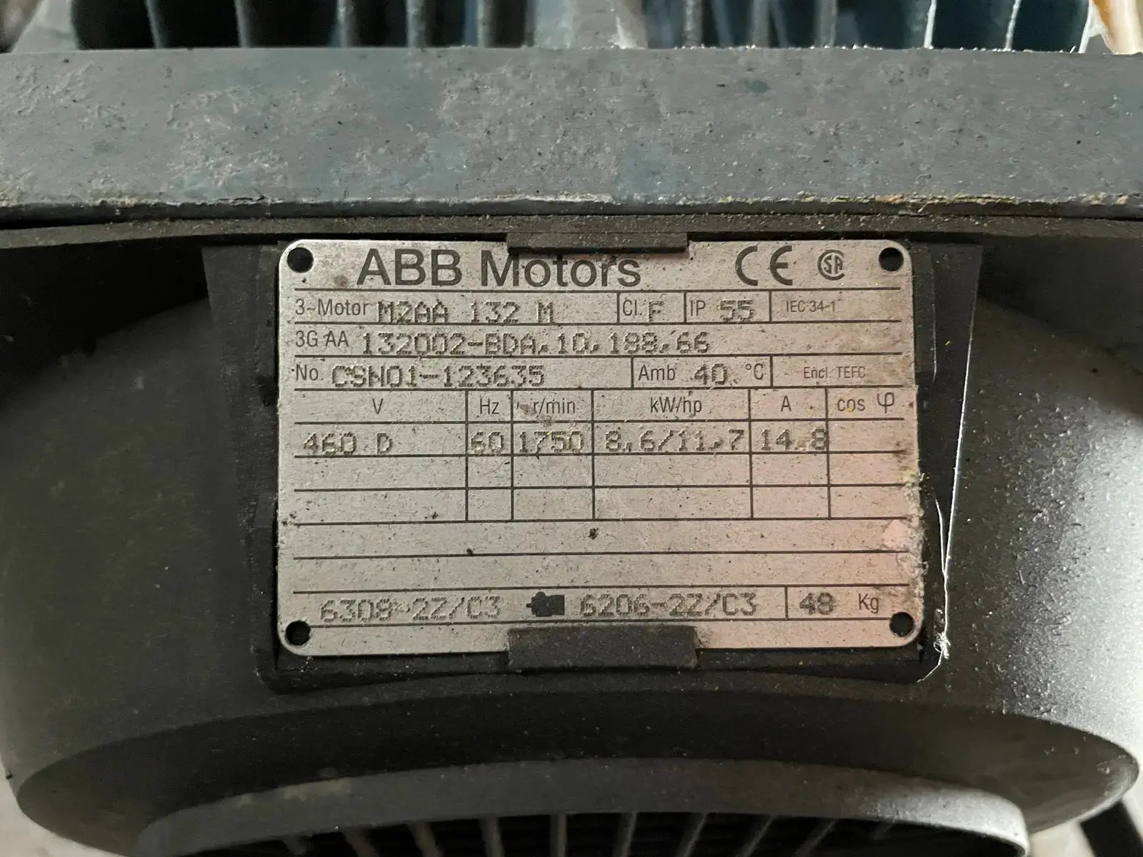 - If Multiple Motors, Motor Descriptions vs specs: 2) ABB MOTORS. 3 PHASE. 440-480V. 1.90AMP. 60HZ. 1740RPM. 1HP. Model No. 080B. Serial No. 2014874. (1) ABB MOTORS. 3 PHASE. 460V. 60HZ. 14.8 AMP. 1750RPM. 11.7HP. Model No. 132M. Serial No. CSN01-123635.