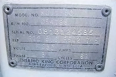 - Included Refrigeration Equipment Description: Thermo King Refrigeration Unit, Model: KD II-50, S/N: 0813124585, refrigerant: R-12, R-502, power supply: 230 V, 60 Hz, 3 phase.