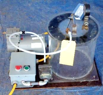 Thomas Vacuum System. Part No. 980216, Model TA-2101. Thomas Motor. 1/6 hp, 1,725/1,450 rpm, 50/60 Hz, 3.3/4.1 amps, 120 volt. Part: 8-140969-03. S/N BX4-22. Inside dimensions 11 in. diameter, 11 1/2 in. H with removable lid. Overall dimensions: 18 in. W, 24 in. L, 19-½ in. H.