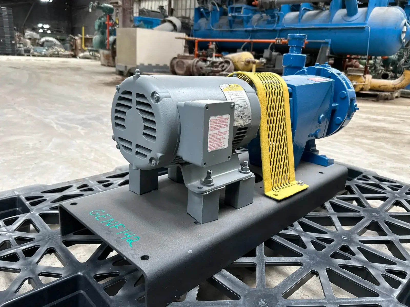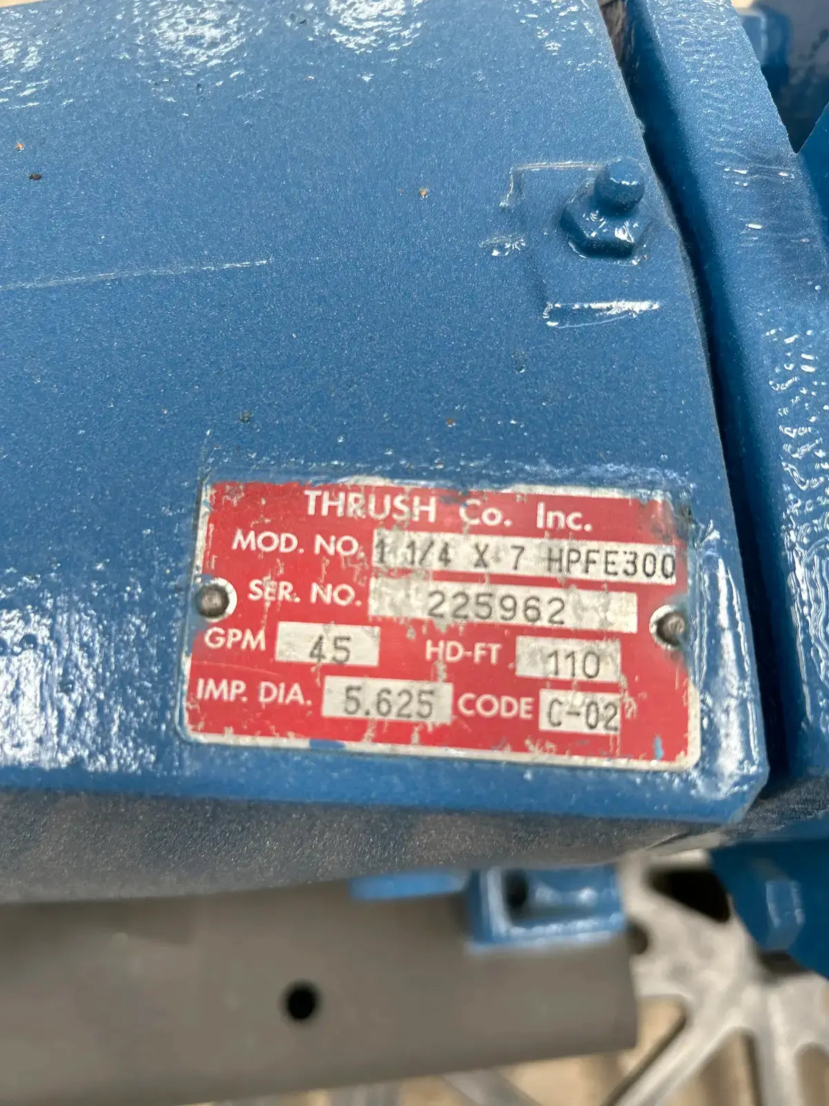 Thrush End Suction Centrifugal Pump. Model: 1-1/4 x 7 HPFE300. Serial No: 225962. GPM: 45. HD-FT: 110. Impeller Dia: 5.625. Code: C-02. Max Working Temperature: 250 F. Working Pressure: 175 PSI.