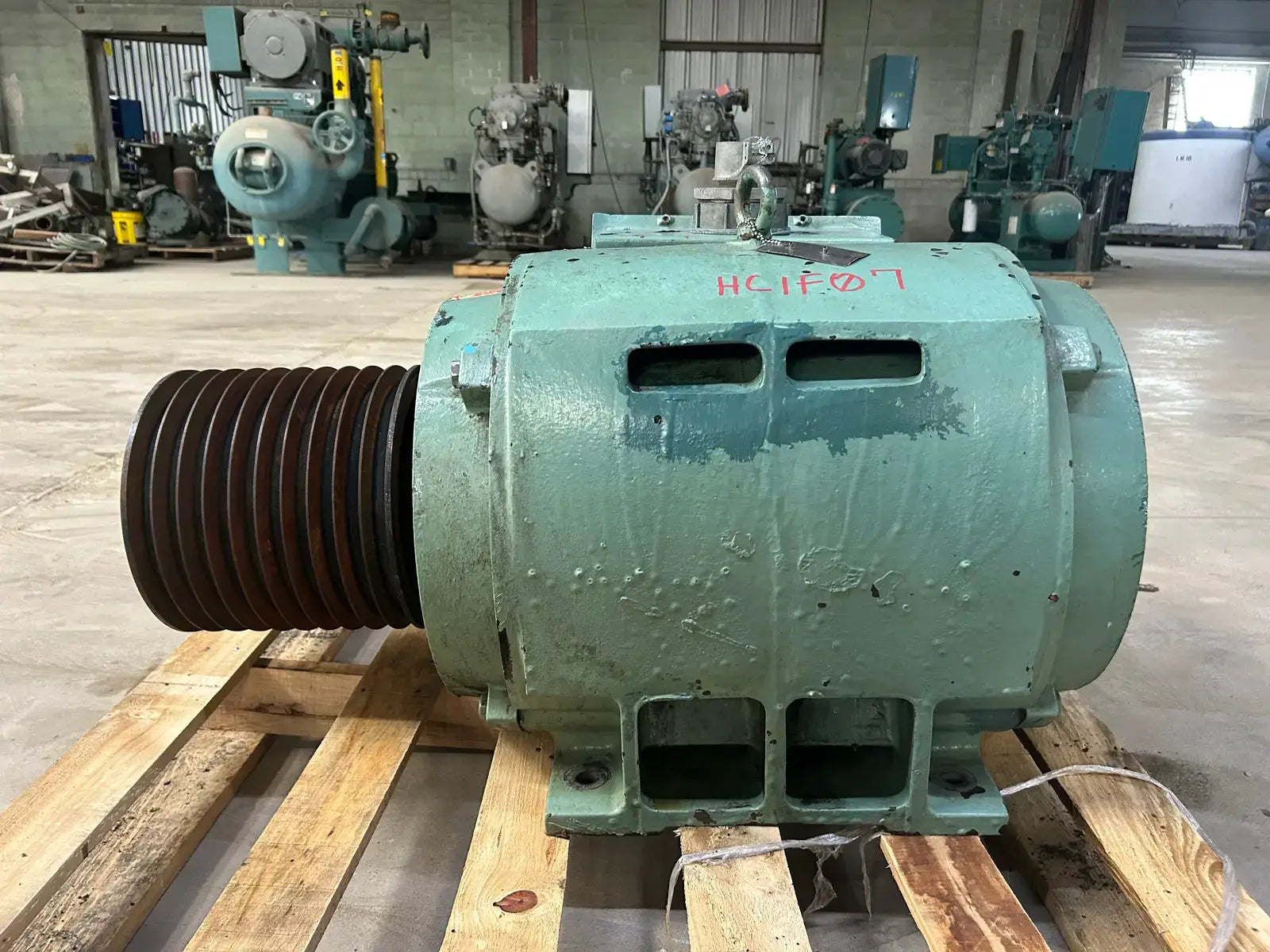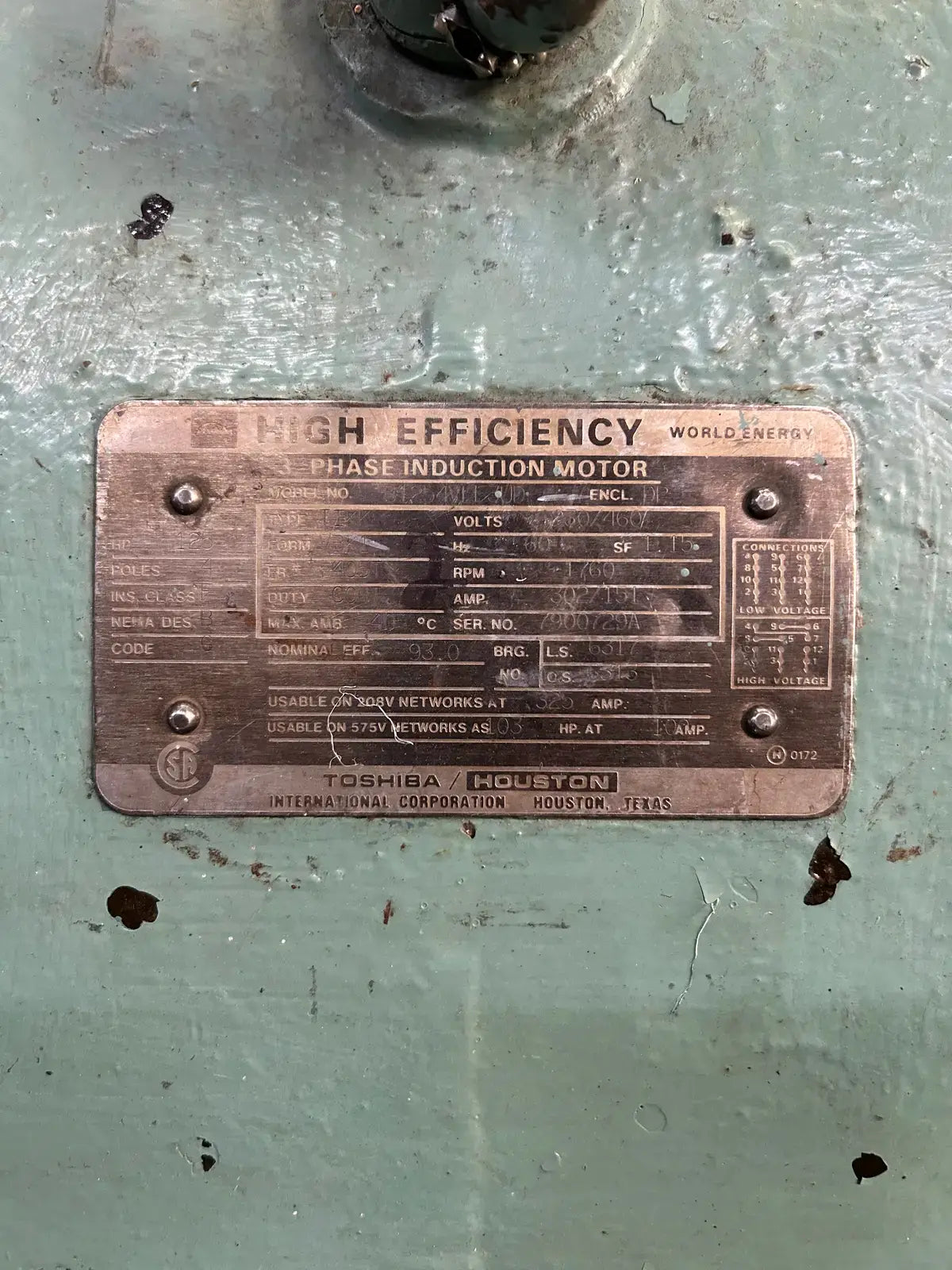 Toshiba High Efficiency Electric Motor. Model: B1254VLL3UD. Serial No: 7900729A. Power Supply Specs - 125 Hp, 230/460 Volt, 3 Ph, 60 Hz, 1760 RPM, 302/151 Amp, 405TZ.