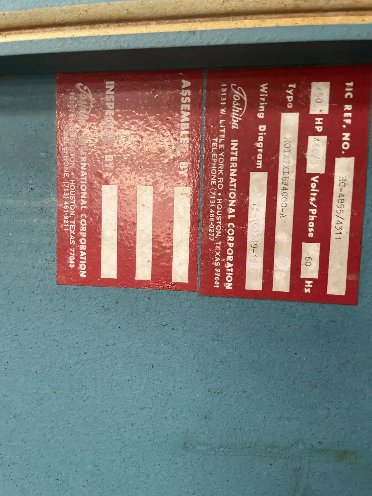 Toshiba Screw Compressor Motor Starters. TIC REF. NO: HC-4855/4311. HP: 450, Volts: 460. Ph: 3. Hz: 60. Type: MOIX7XLBF4C00-A. Wiring DiagRam Industries: 73-103. MDL3800F Cutler-Hammer MDL-Frame 50k Thermal Magnetic Molded Case Circuit Breaker.