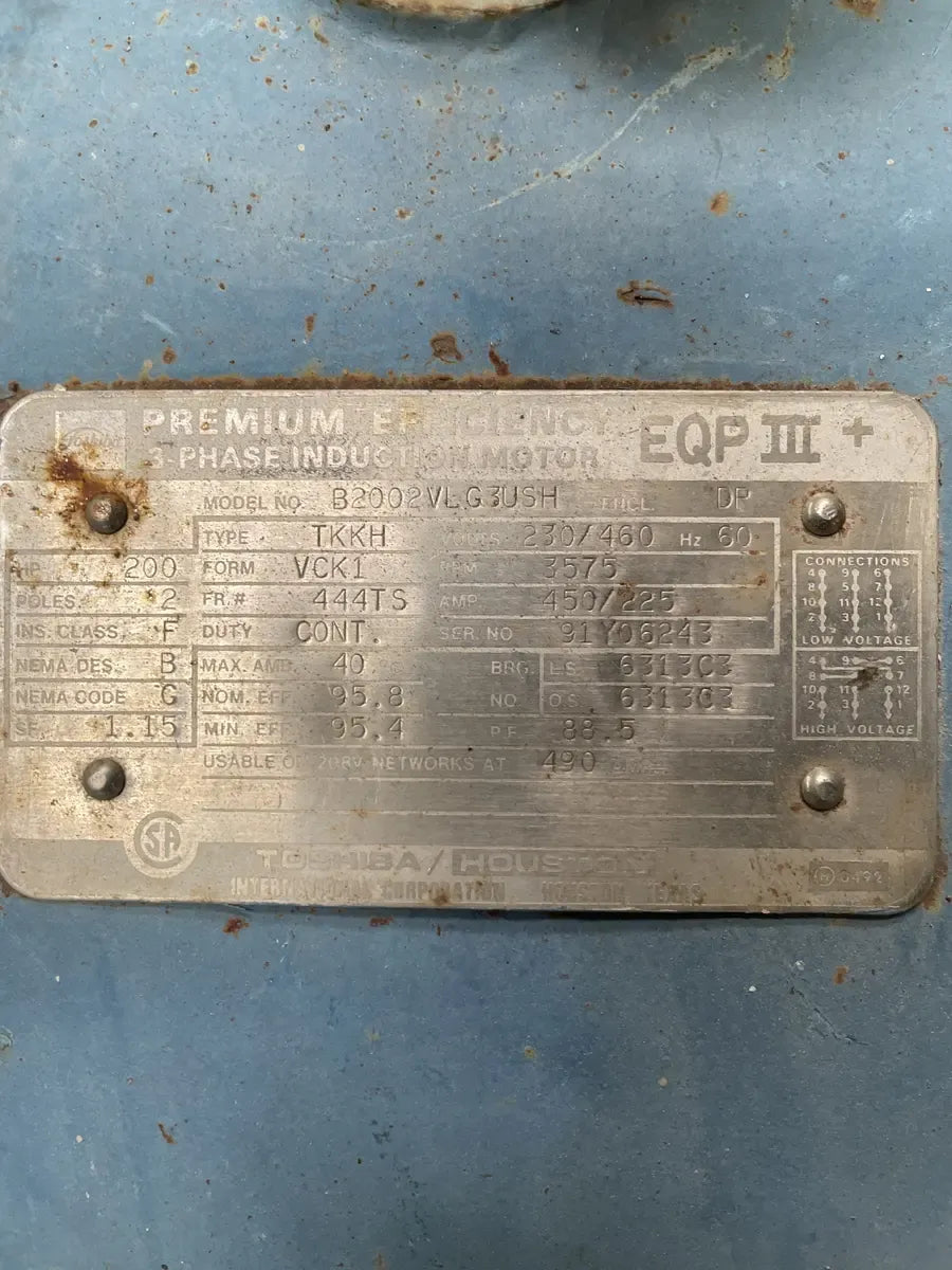 Toshiba Premium Efficiency Motor. HP: 200, Model: B2002VLG3USH, Encl: DP, Type: TKKH, Volts: 230/460, Hz:60, Form:VCK1, RPM: 3575, AMP: 450/225, Duty: Cont, Frame:444TS, Serial No: 91Y06243, Max AMB: 40, Nom Eff: 95.8, Min Eff: 95.4, SF: 1.15.
