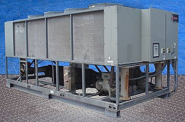 1996 Trane Air Cooled Chiller – 70 Tons. Model: RTAA0704XFQ1A1D0BFGR. S/N: U96D33922. (2) Trane Helirotor Compressors A & B 460 V, 50 RLA, 330 LRA, 60 Hz, 3 phase. (8) 29 in. dia fans with Motor, 1 hp, 60 Hz, 850 rpm, 200-230/460 V, 5.1-5.0/2.5 amps, Control Circuit, 115 V, 750 amps (max), 60 Hz, 1 phase. Evaporator Heat Tape, 115 V, 750 amps (max), 60 Hz, 1 phase. R-22 refrigerant with 58 lb. charge each. Overall dimensions: 17 ft. L x 94 in. W x 8 ft. H. (ACN400).