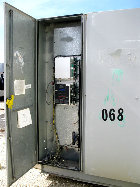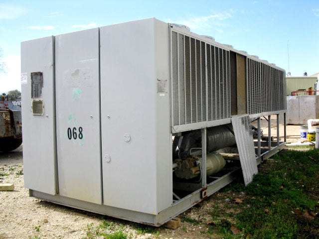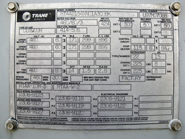1997 Trane Air Cooled Liquid Chiller. Model: RTAA2154XN01A3COBK. Refrigerant: R-22. Refrigerant side factory test pressure hi/lo: 450/300 psig. System requirements: 460 V, 60 Hz, 3 phase. Trane Helirotor compressor: model: CHHB100TKA0R119AHNN, S/N: N09G00565, 460/400V, 60/50Hz, 3 phase. Trane Helirotor compressor: model: CHHB199TNKON119A, S/N: UA7M581, 460/400V, 60/50Hz, 3 phase. (14) Condenser Fan Motors, 1-1/2 hp, 460 V, 2.8 FLA, 60 Hz, 3 phase. Compressor A starts 2488. Compressor A hours 18158. Compressor B starts 3618. Compressor B hours 38905. Overall dimensions: 23 ft. 2 in. L x 7 ft. 5 in. W x 7 ft. 11 in. H.