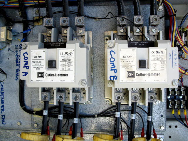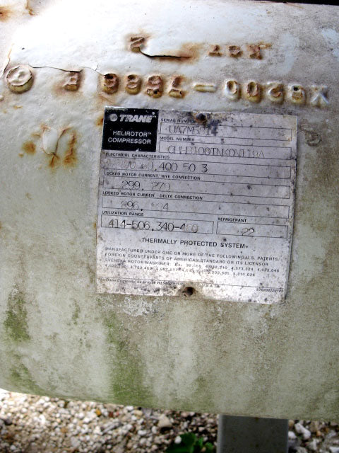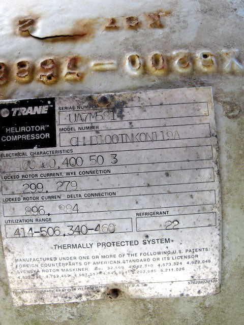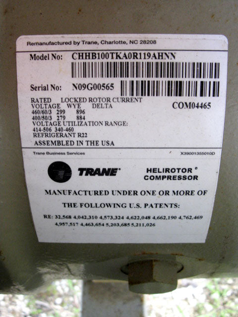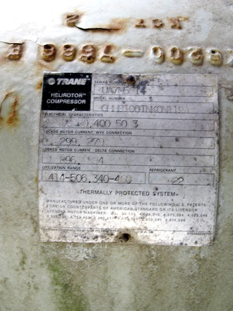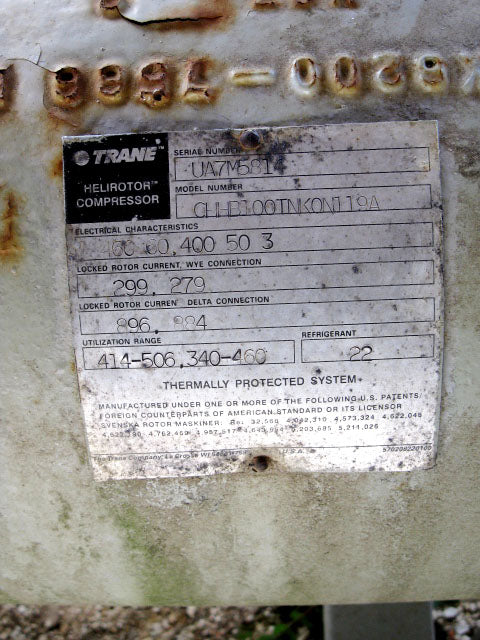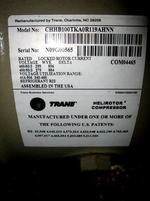 - Compressor Descriptions: Trane Helirotor compressor: model: CHHB100TKA0R119AHNN, S/N: N09G00565, 460/400V, 60/50Hz, 3 phase. Trane Helirotor compressor: model: CHHB199TNKON119A, S/N: UA7M581, 460/400V, 60/50Hz, 3 phase. Compressor A starts 2488. Compressor A hours 18158. Compressor B starts 3618. Compressor B hours 38905.