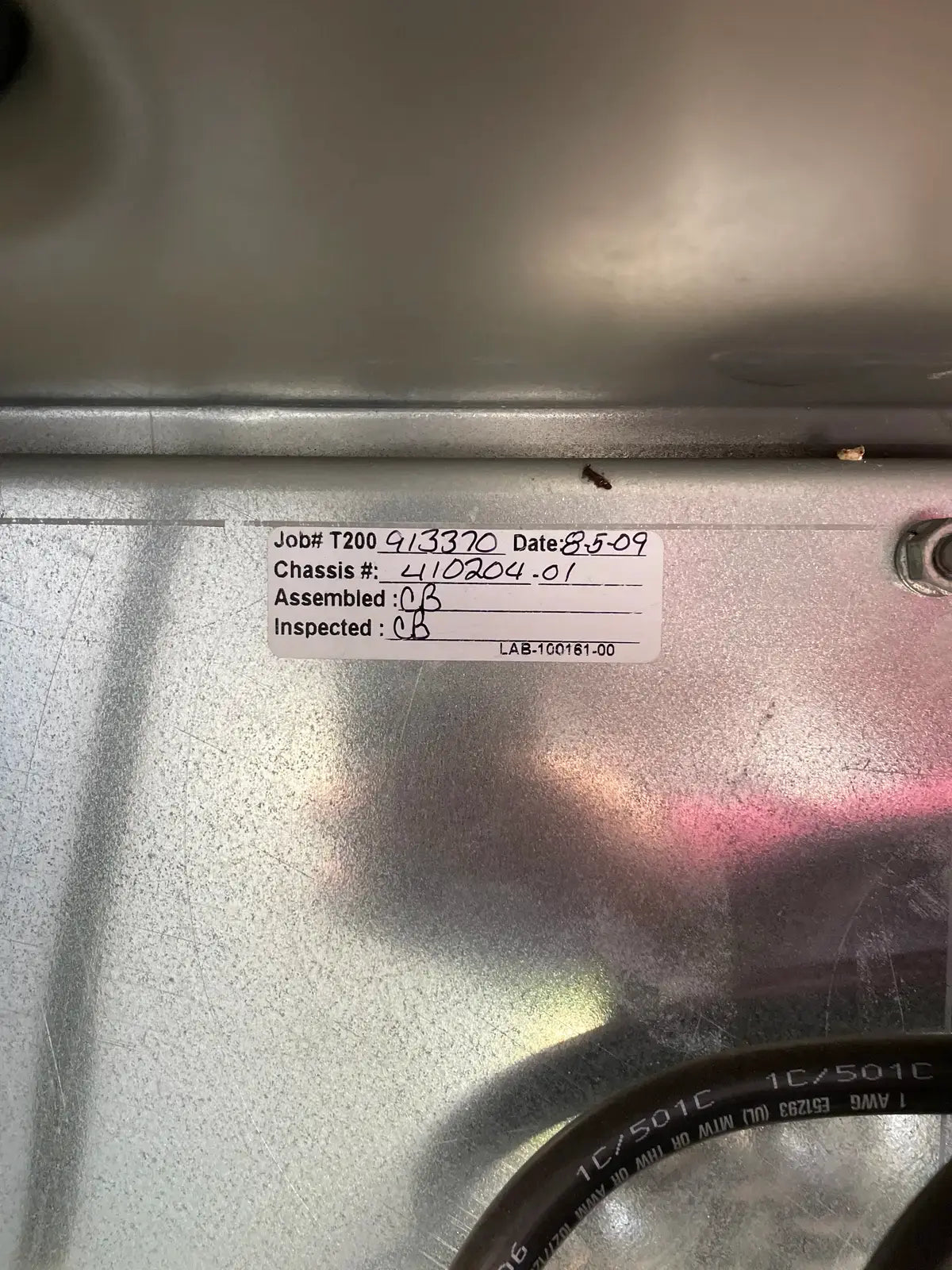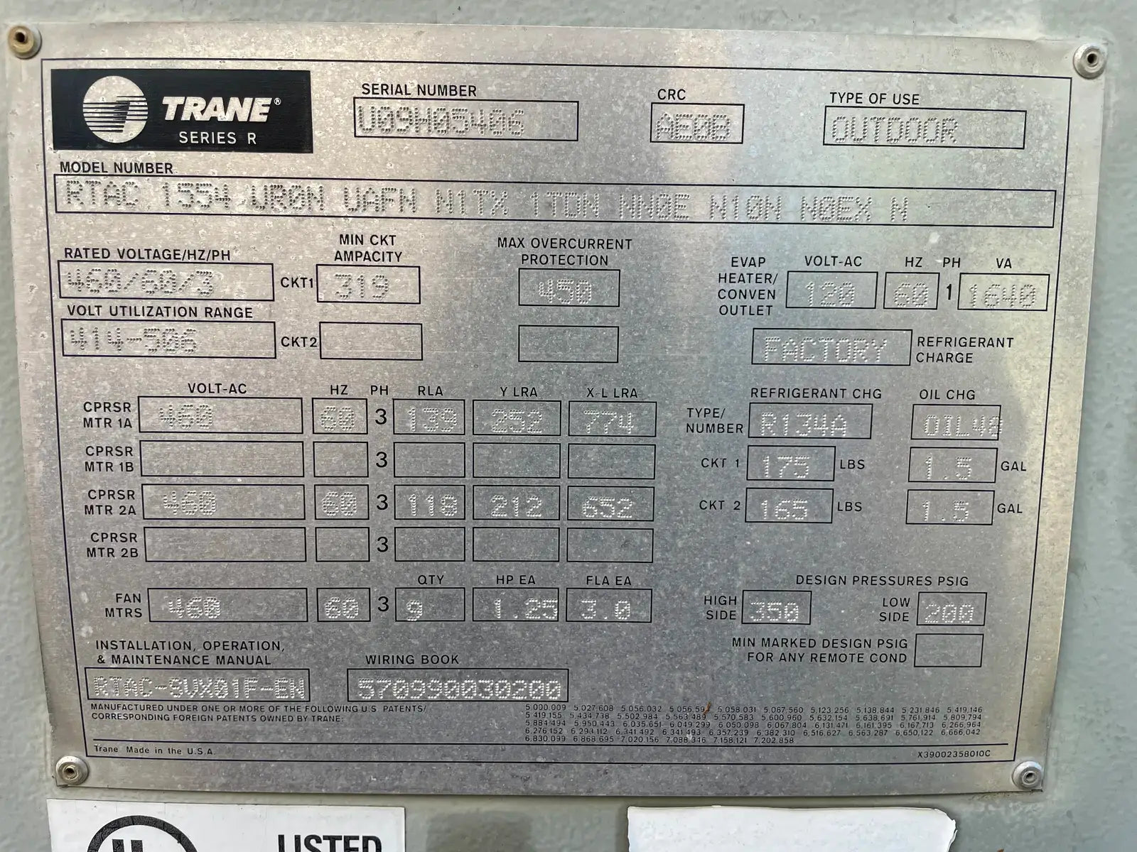 Trane Air-Cooled Series R Chiller. Model: RTAC-1554-UR0N-UAFN-N1TX-1TDN-NN0E-N10N-N0EX-N. Serial No: U09H05406. Type of Use: Outdoor. Design Pressure(PSIG): High Side: 350, Low Side: 200. Refrigerant Type: R134A. Rated Voltage/Hz/Ph: 460 Volts, 60Hz, 3 Ph. Total Tonnage: 155.
