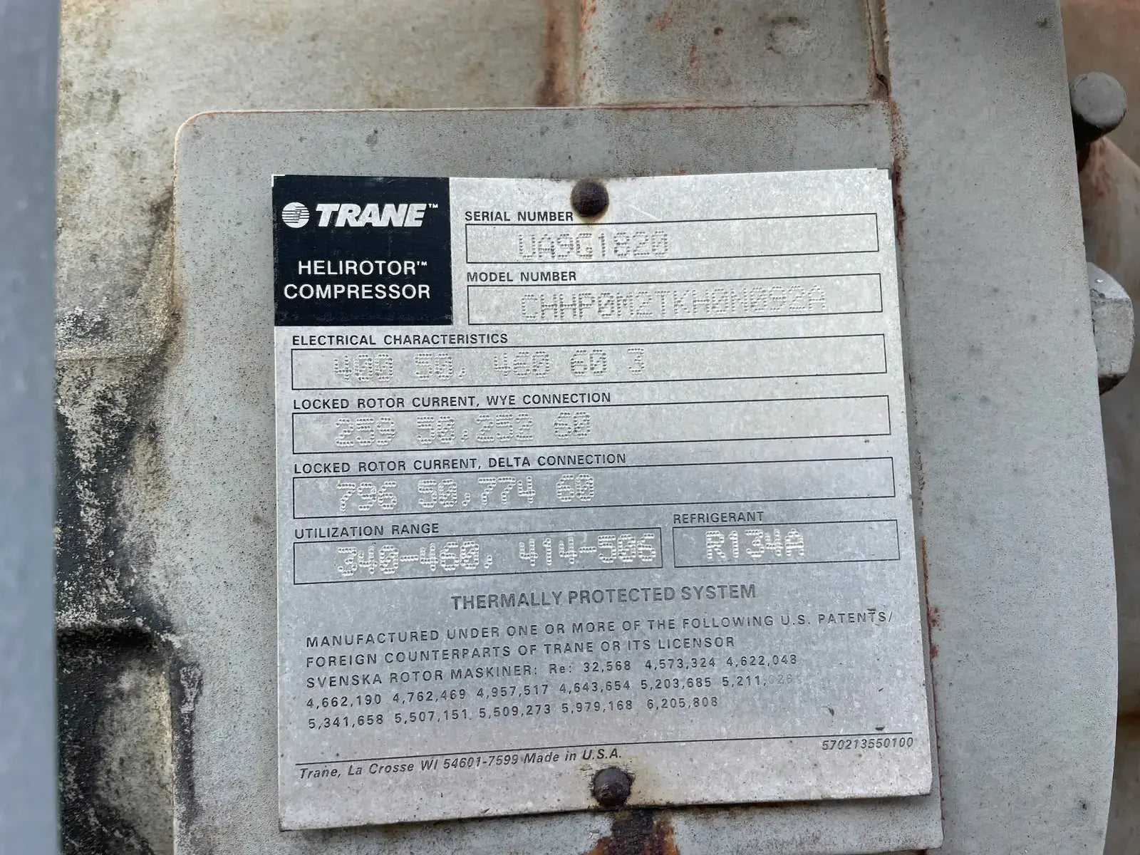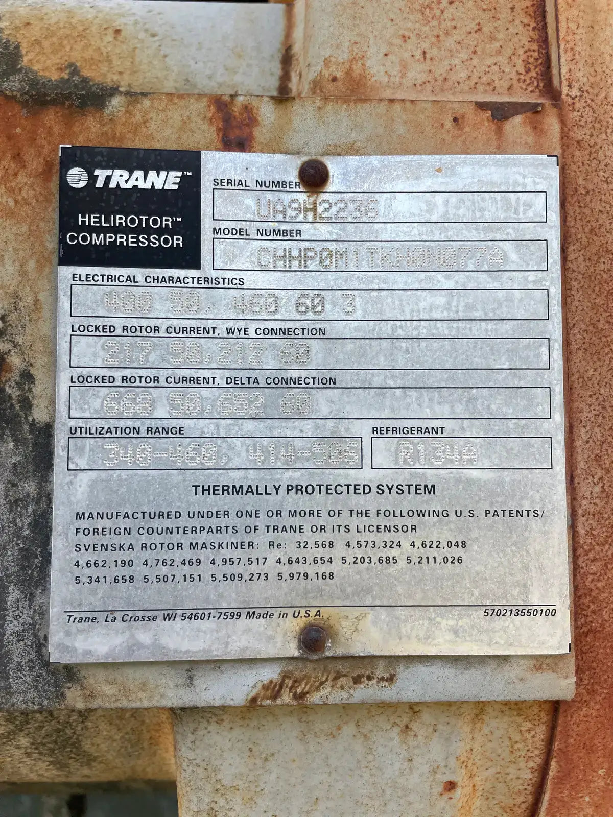 - Compressor Descriptions: (2) Trane Helical Rotary Hermetic Compressor: Model: CHHP0M2TKH0N092A, Serial No: UA9G1820. Capacity: 85 Tons. Motor Voltage: 460v/60Hz/3Ph. Total HP: 123.3/0.92Kw.