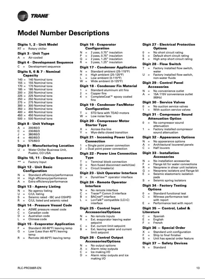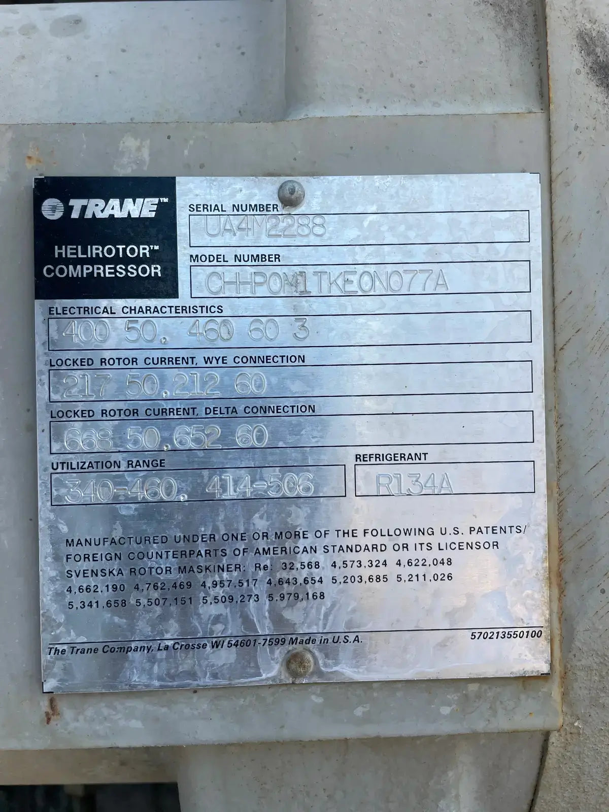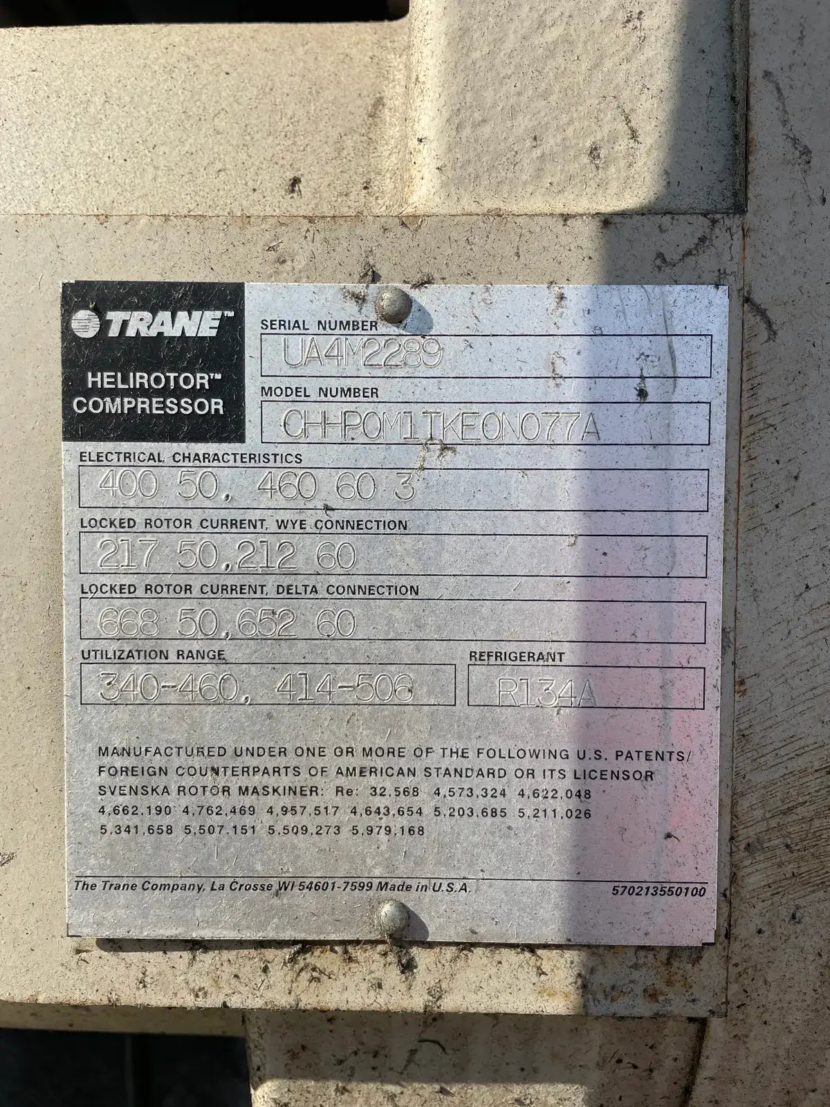 Used Trane Air-Cooled Series R Chiller. Model: RTAC-1404-UJ0N-UAFN-N1NY-1TDN-RA5E-N. Serial No: U05A09501. Nominal Tons: 140. Rated Voltage: 460/60/3. Refrigerant: R134A. Design Pressure: High Side: 350, Low Side: 200.