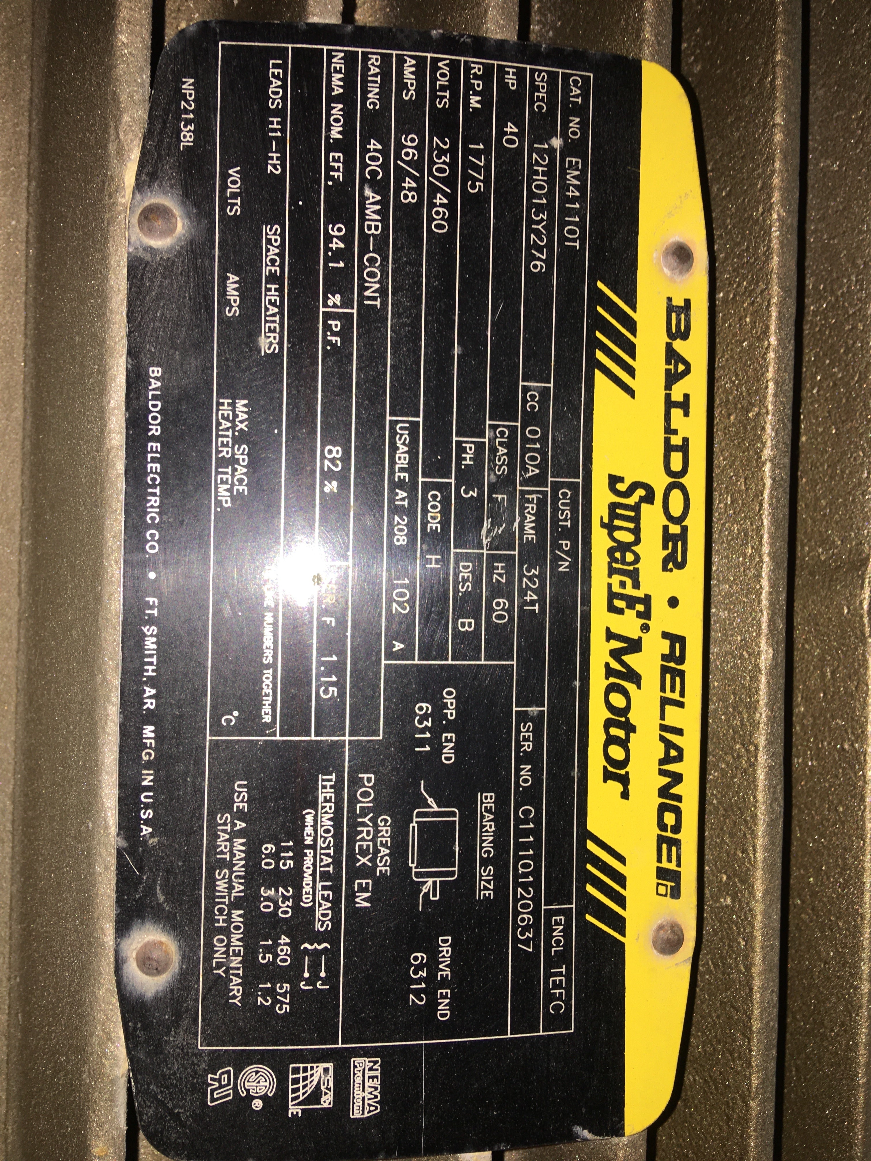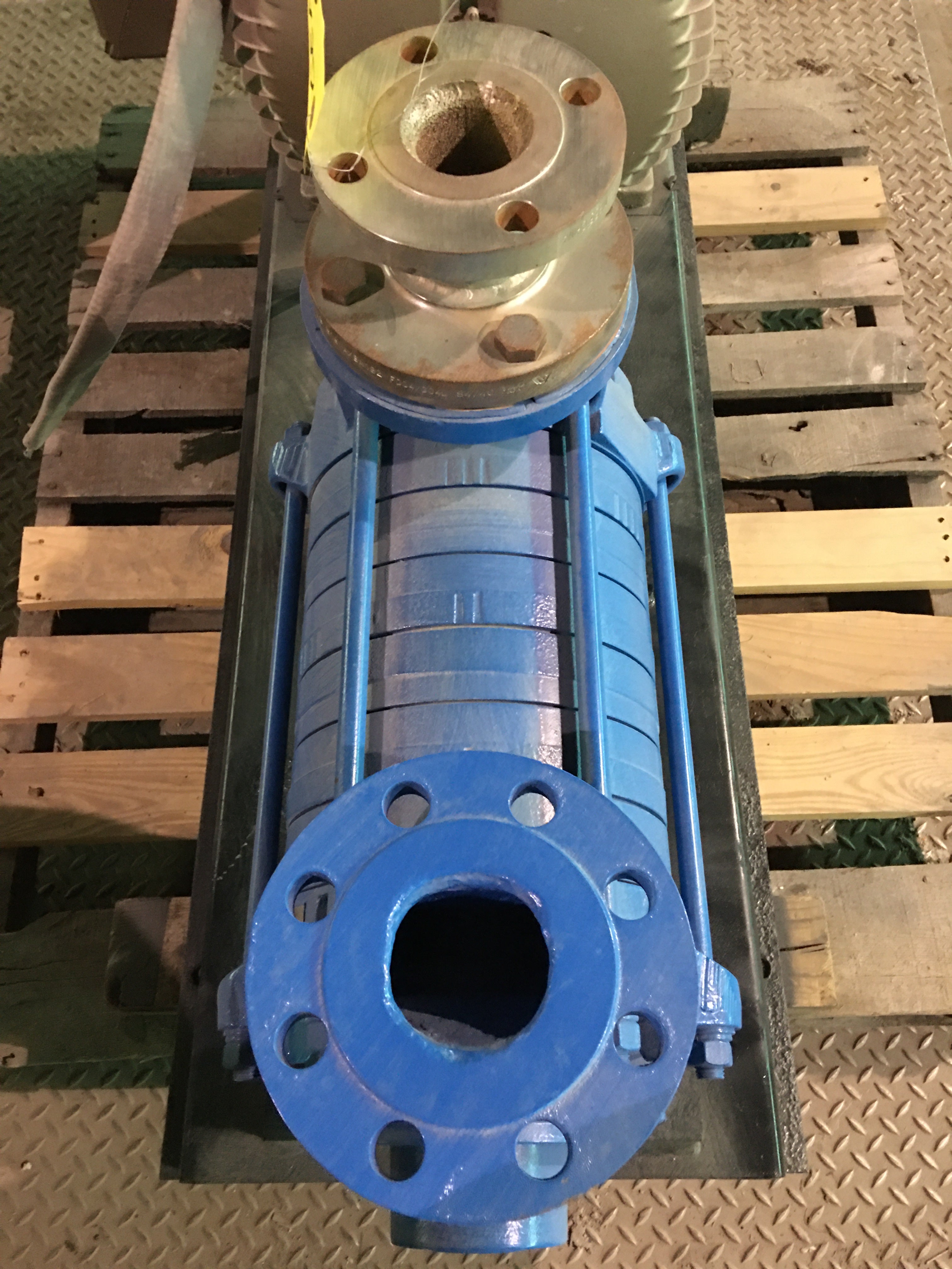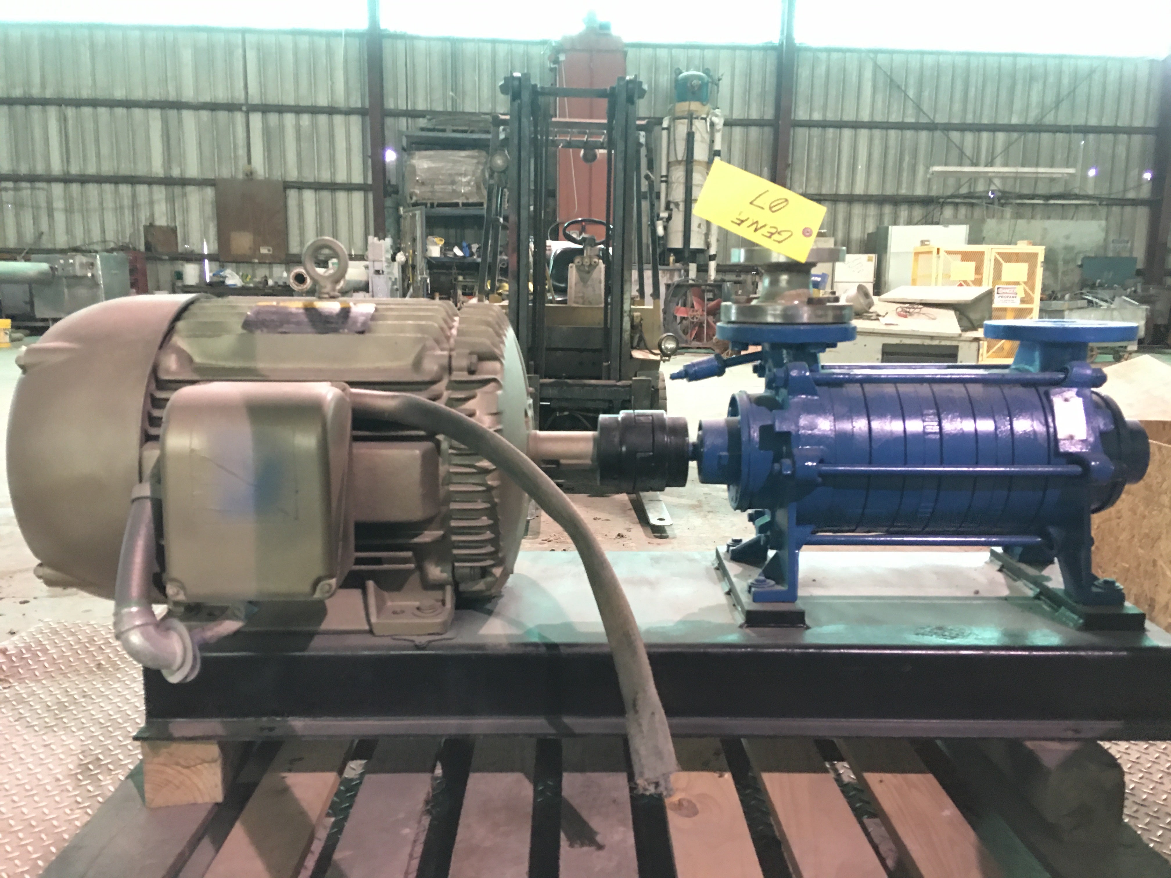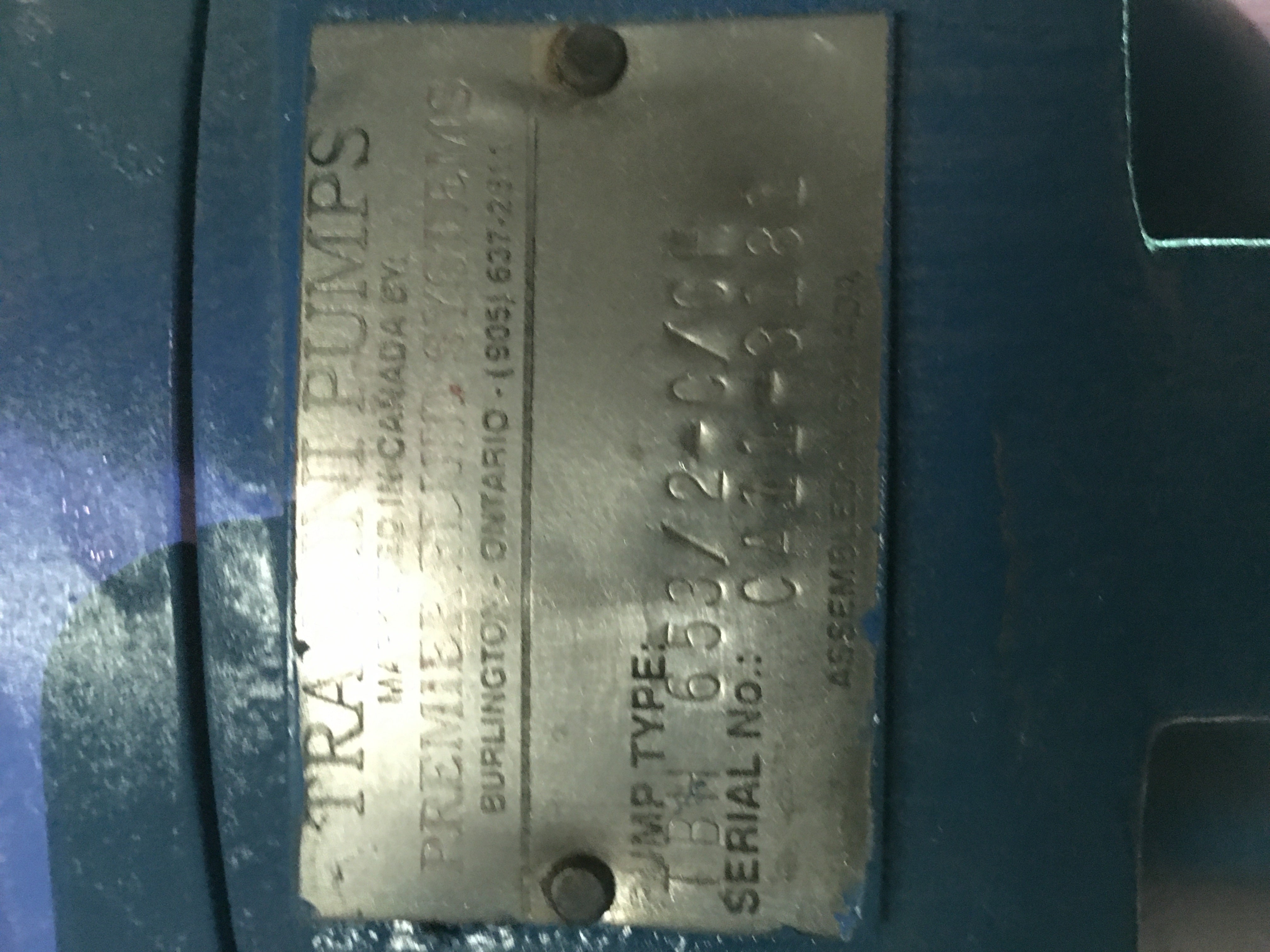Travaini Pump: Pump Type: TBH 653/2-C/6E, Serial No: CA11-3181. Head Capacity 50 to 1120 ft. Features Low Vibration and Noise level for Maximum Reliability.. Pump Size 65. Vertical PN40 Flanges. Baldor Motor: Cat No: EM4110T, Spec: 12H013Y276, Cust: P/N, Encl: TEFC, Cc: 010A, Frame: 324T, Ser No: C110120637, HP: 40, RPM: 1775, Class F, HZ: 60, PH:3, Des: B, Volts: 230/460, Code: H, Amps: 96/48, Usable at 208 102A, Rating: 40C AMB-CONT, Nema Nom Eff: 94.1.