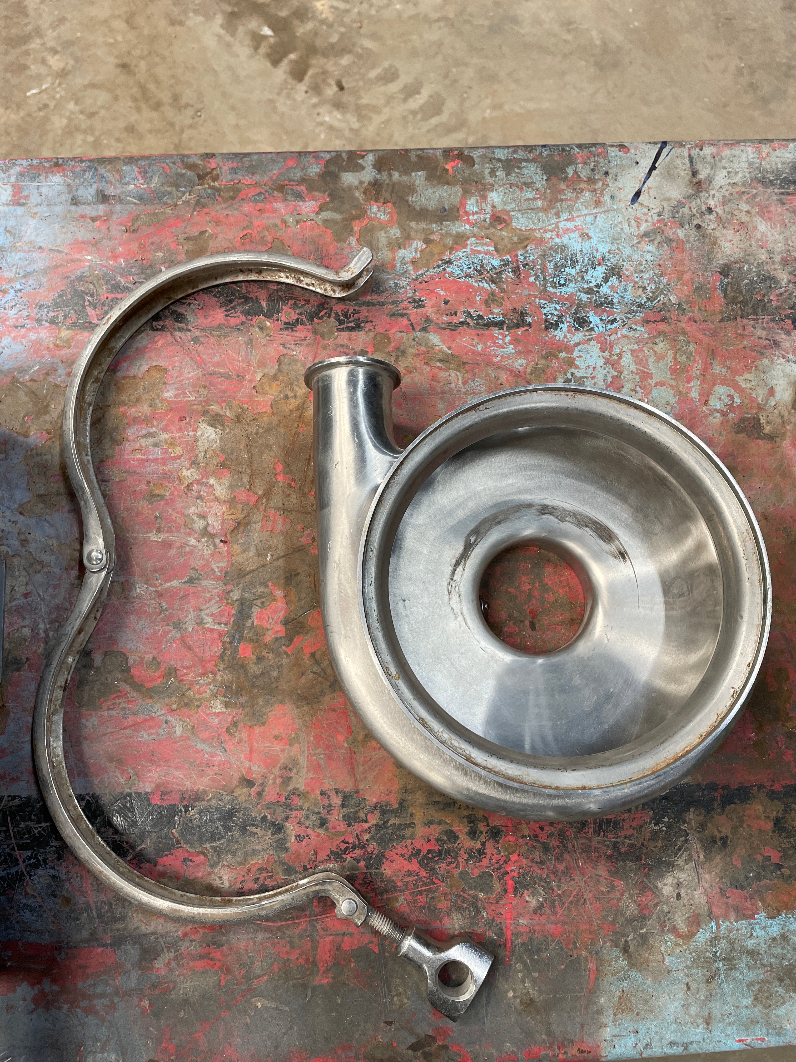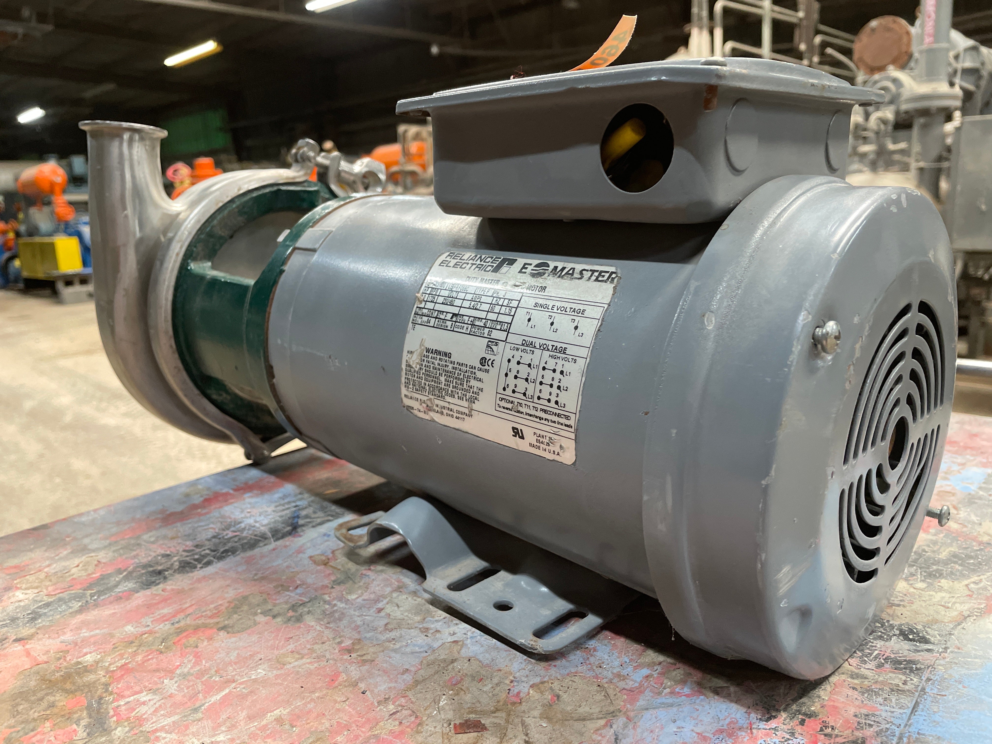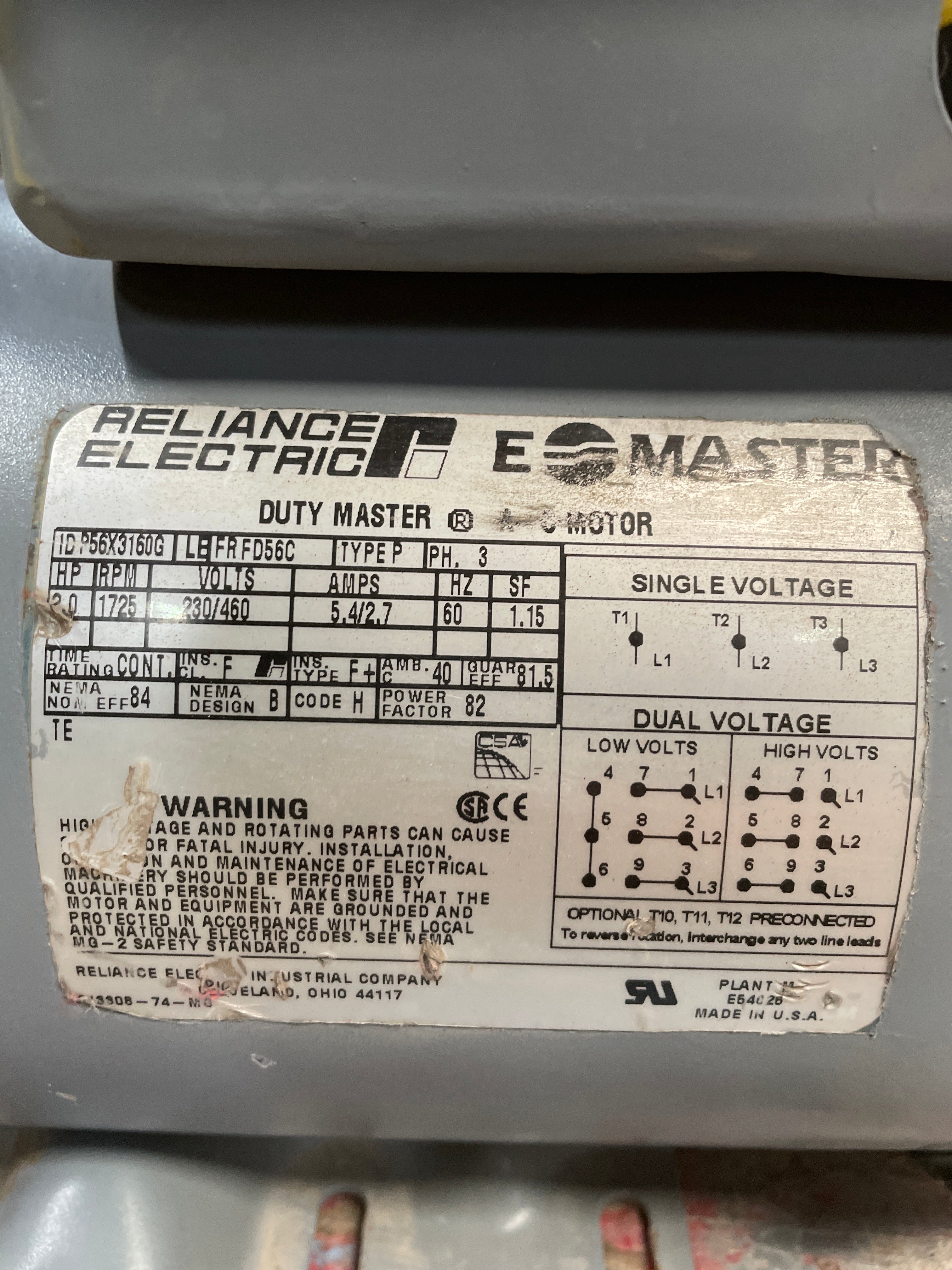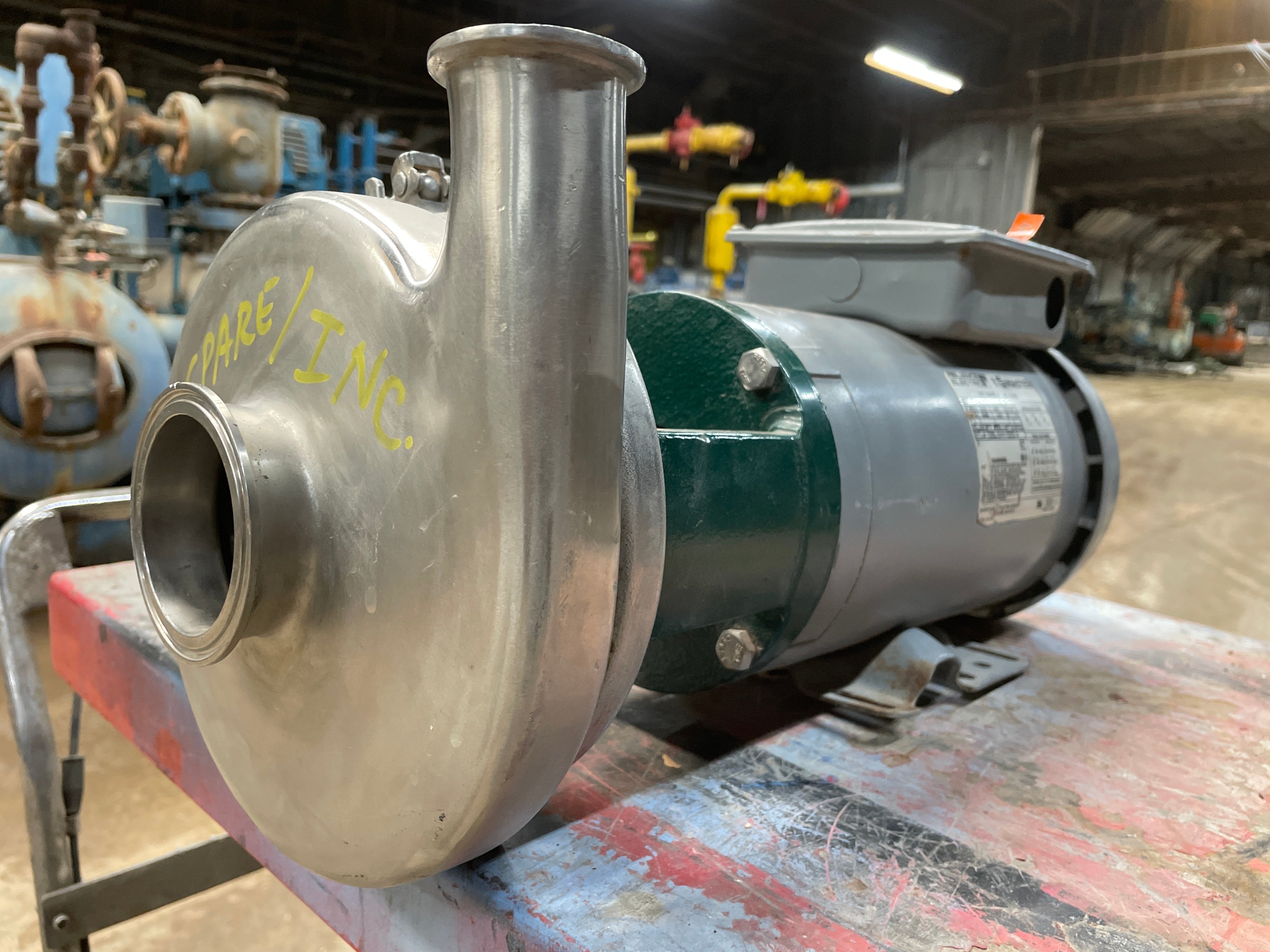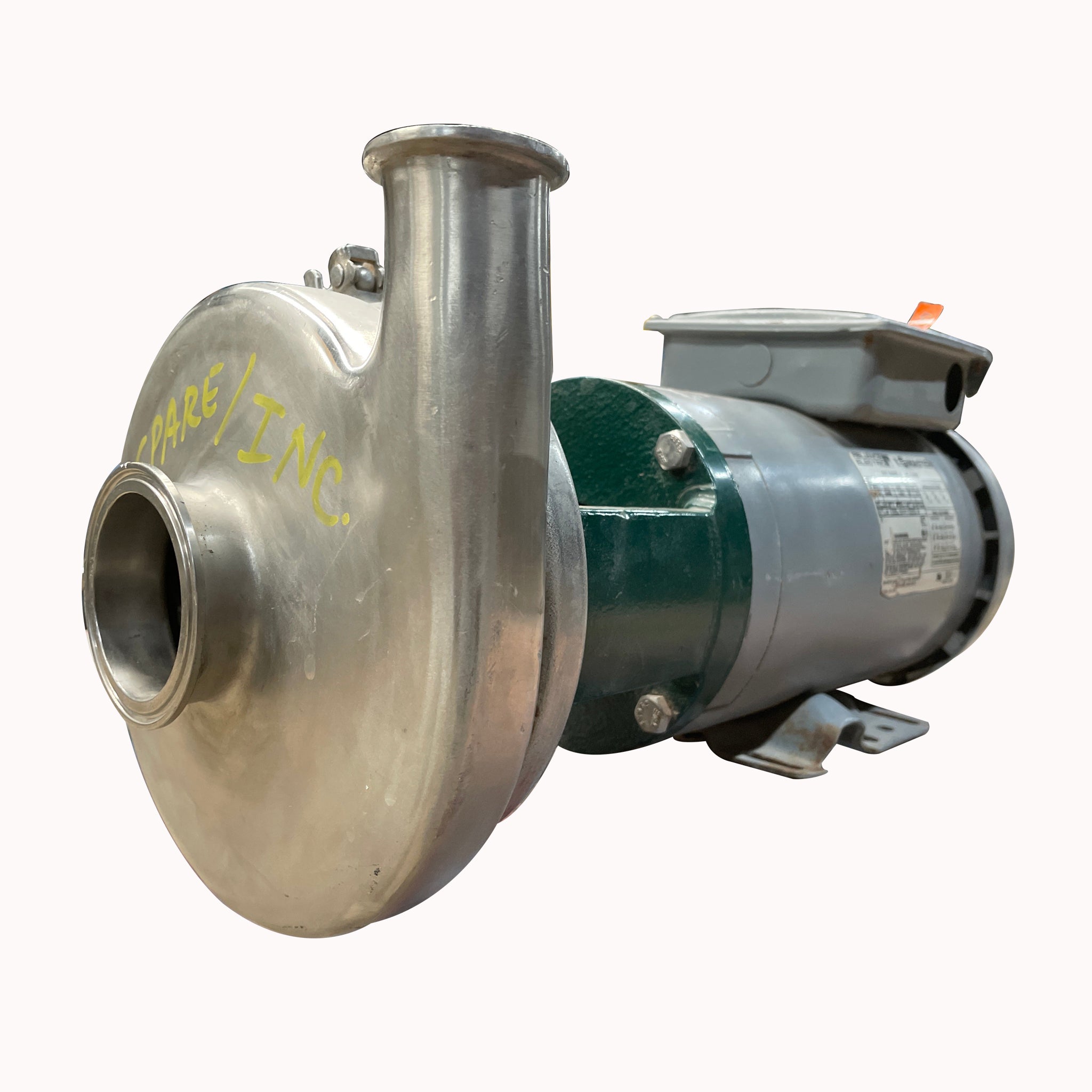 Tri-Clover Tri-Flo Centrifugal Pump - Pump is missing Data Plate. Stainless Steel Impeller Diameter: 5 in. Inlet Dia: 3 in. Outlet Dia: 2 in. Reliance Electric Motor - Serial: P56X3160G, PH: 3, HP: 2, RPM: 1725, Volts:230/460, AMPS: 5.4/2.7, Hz: 60, SF: 1.15.