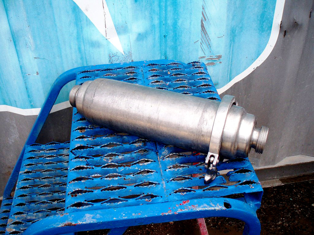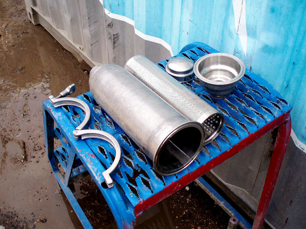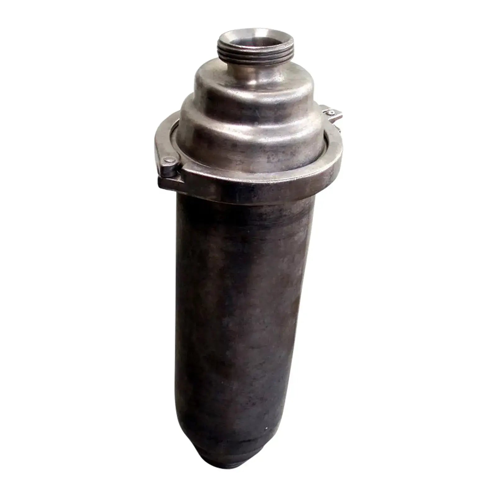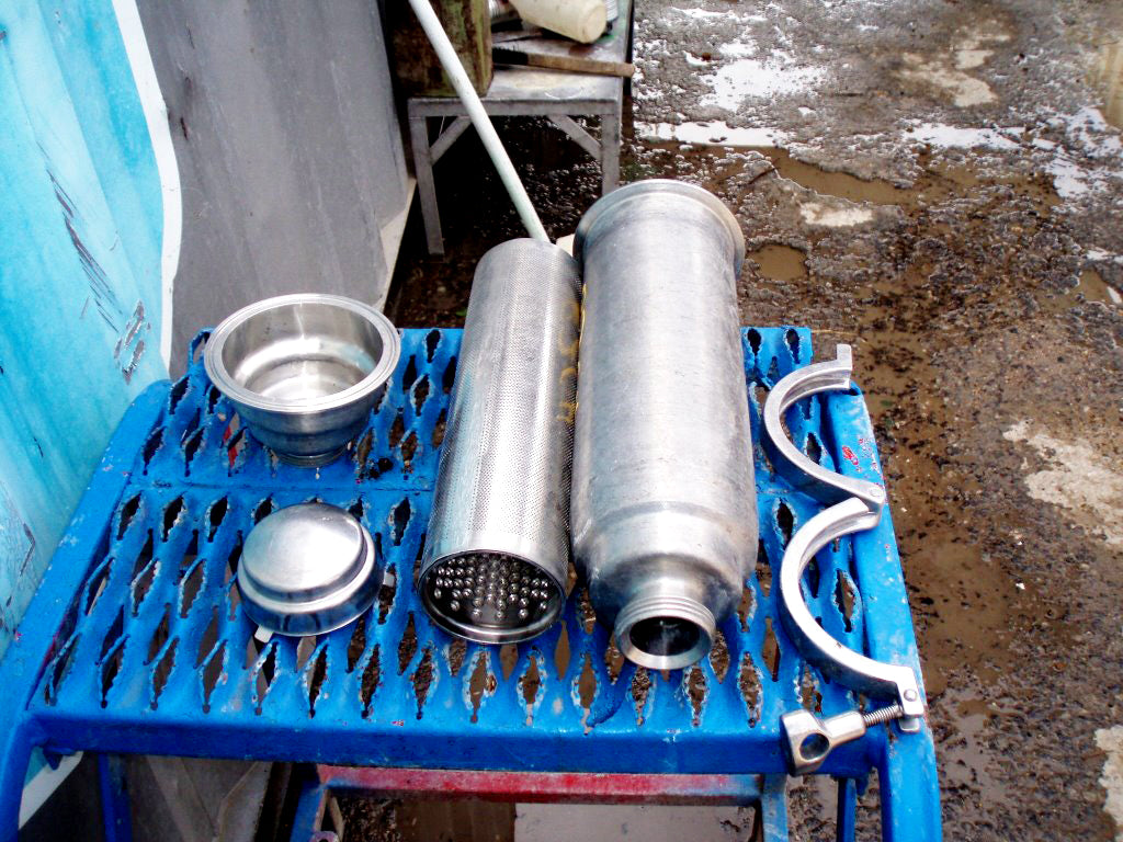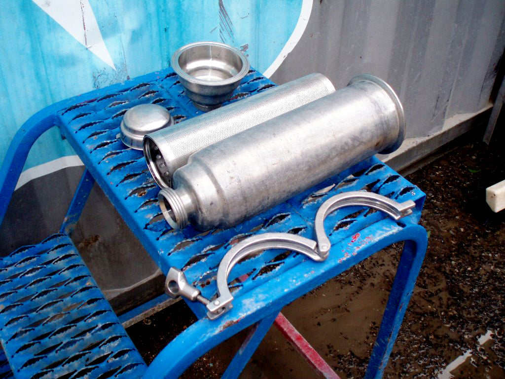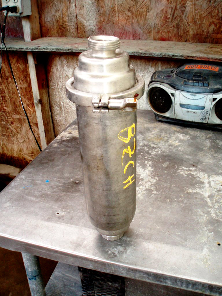 Tri-Clover In- line Filter. 4 in. dia. x 12 in. L. Filter size: 3 in. dia. x 11 in. L. Hole size: 1/32 in. Inlets/outlets: (2) 1-1/2 in. ACME fittings. Overall dimensions: 7 in. L x 4-1/2 in. W x 1 ft 4 in. H.