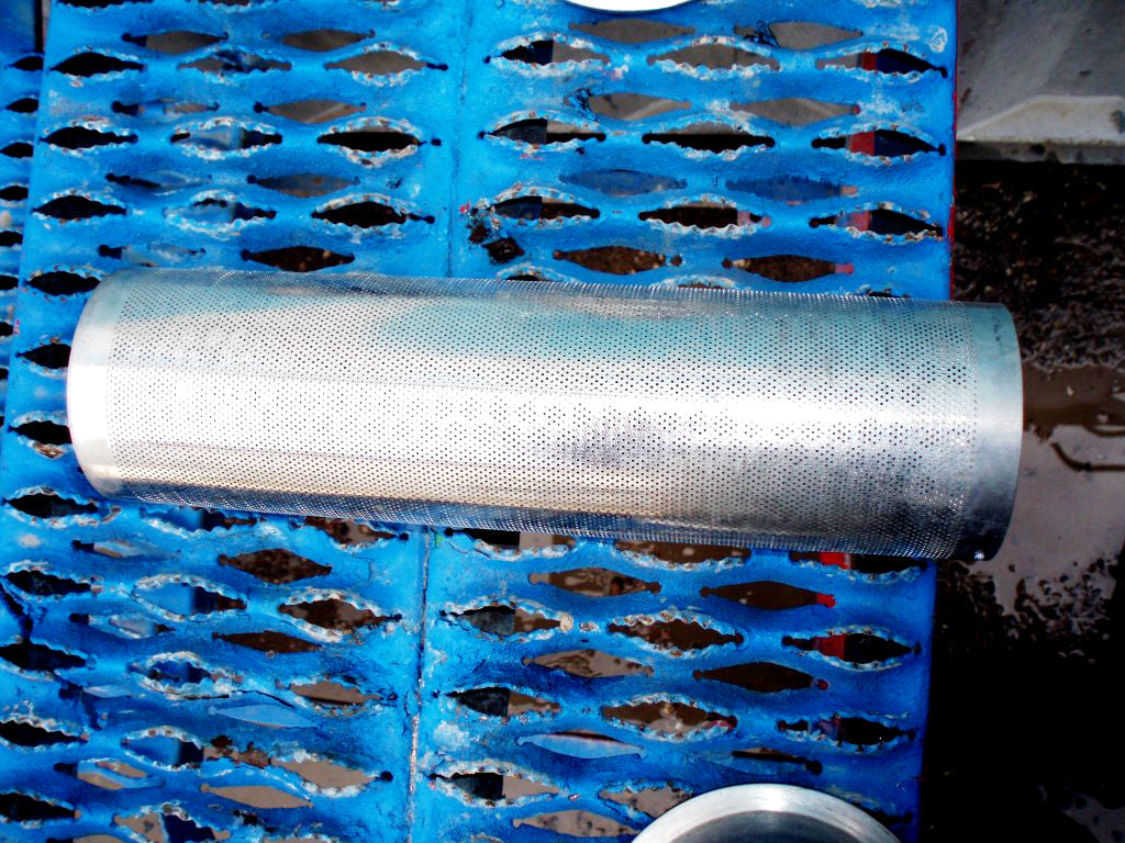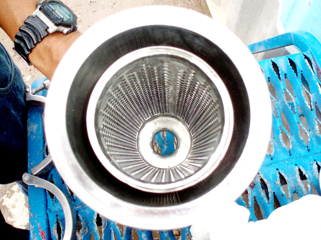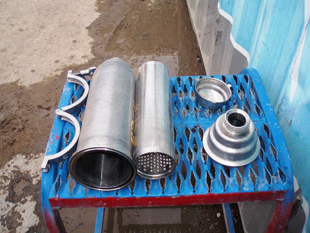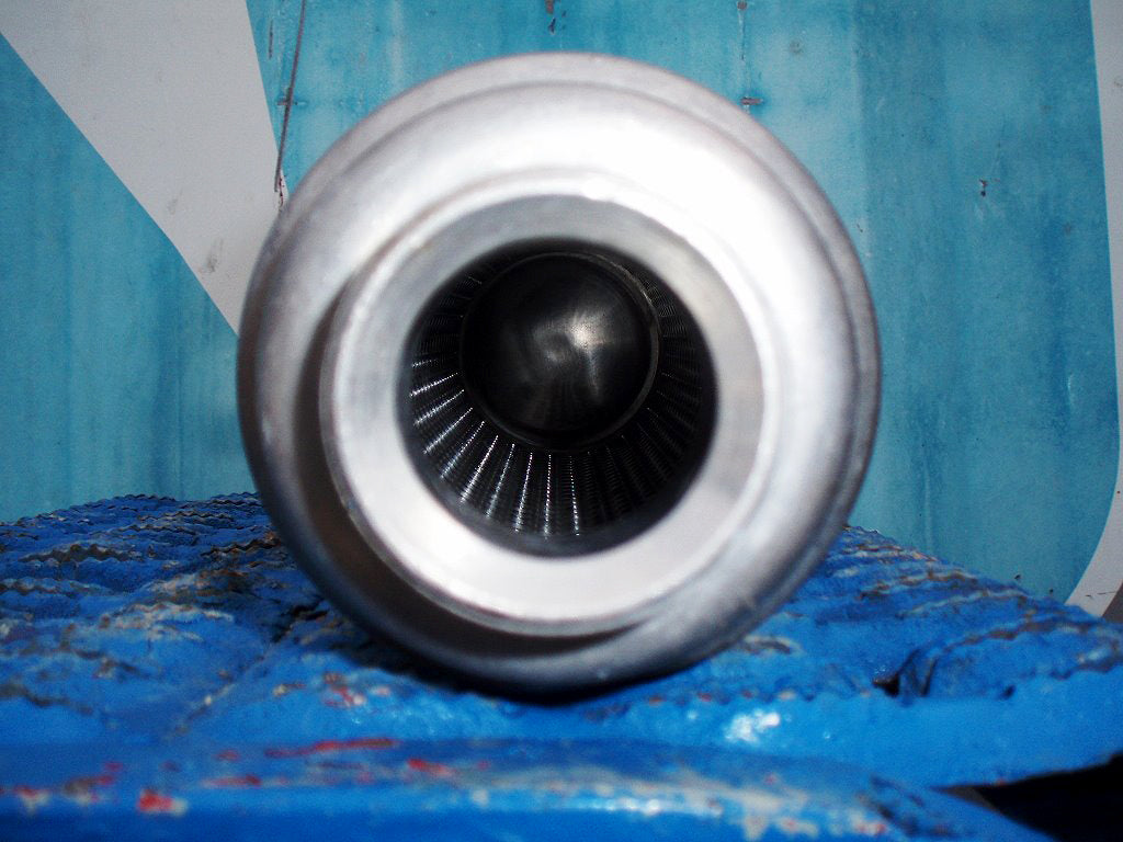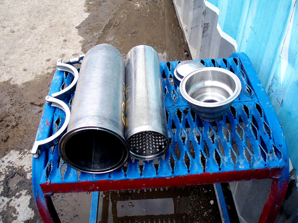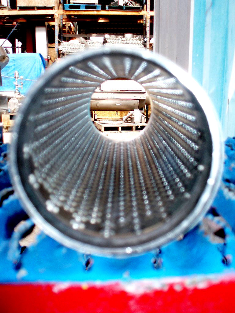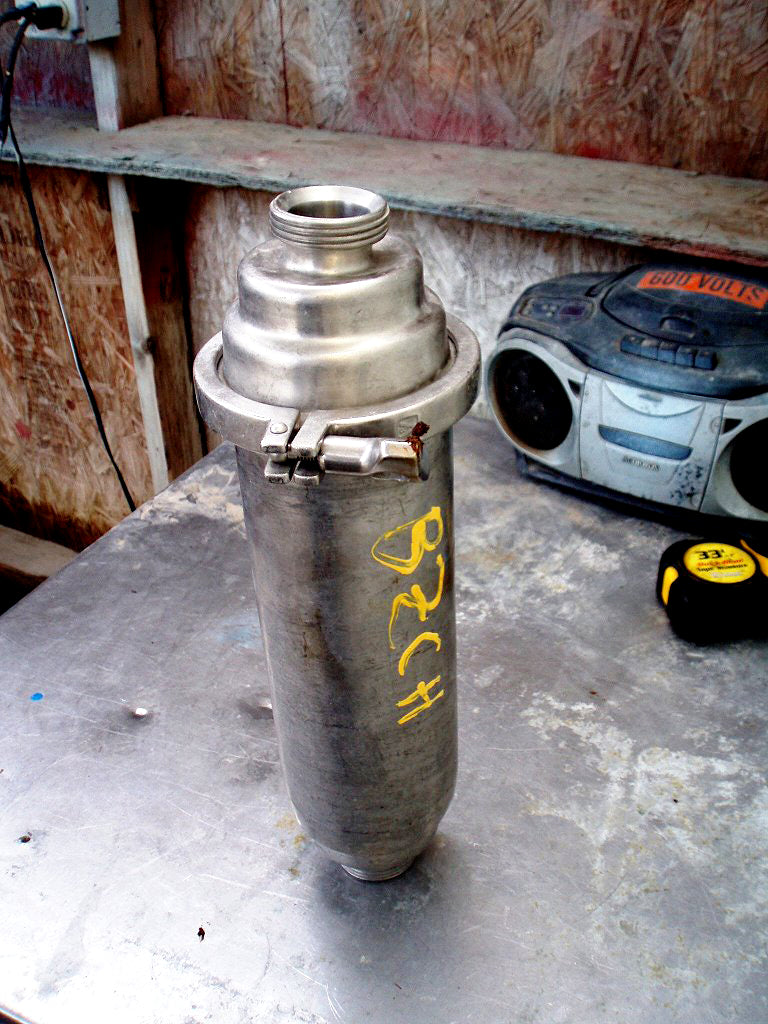 Tri-Clover In- line Filter. 4 in. dia. x 12 in. L. Filter size: 3 in. dia. x 11 in. L. Hole size: 1/32 in. Inlets/outlets: (2) 1-1/2 in. ACME fittings. Overall dimensions: 7 in. L x 4-1/2 in. W x 1 ft 4 in. H.