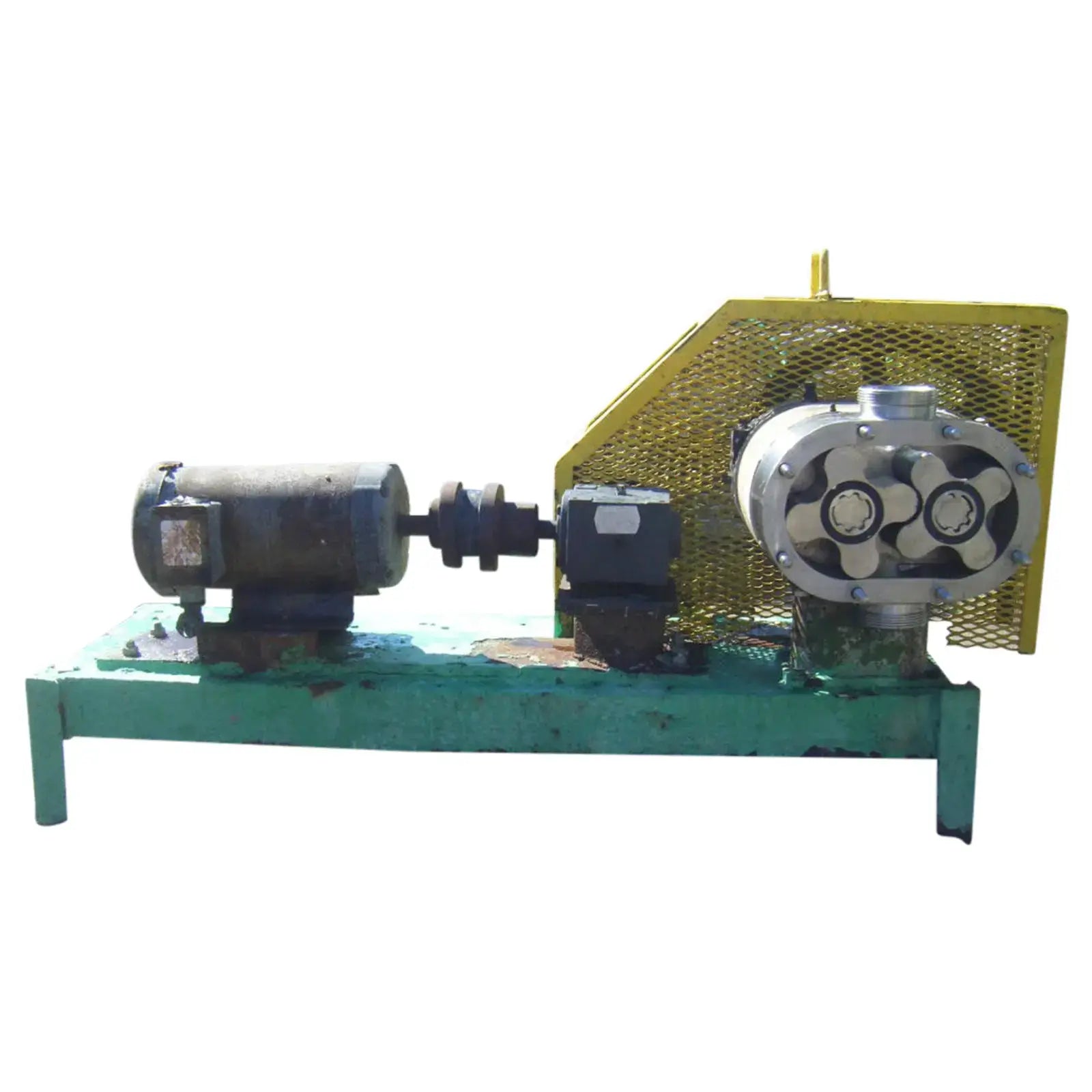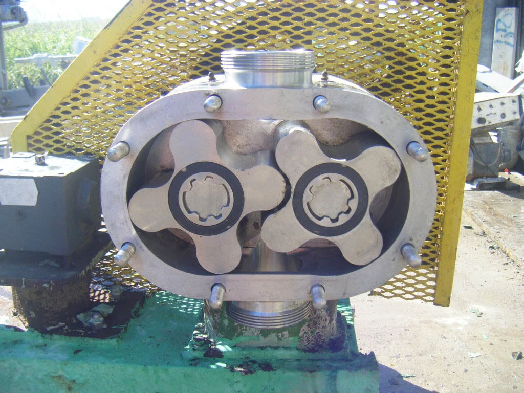 Tri-Clover Positive Displacement Pump. (2) 6 in. rotors. Inlet/outlet: (2) 3 in. acme. Overall dimensions: 4 ft. 8 in. L x 1 ft. 10 in. W x 2 ft. 5-1/2 in. H.
