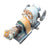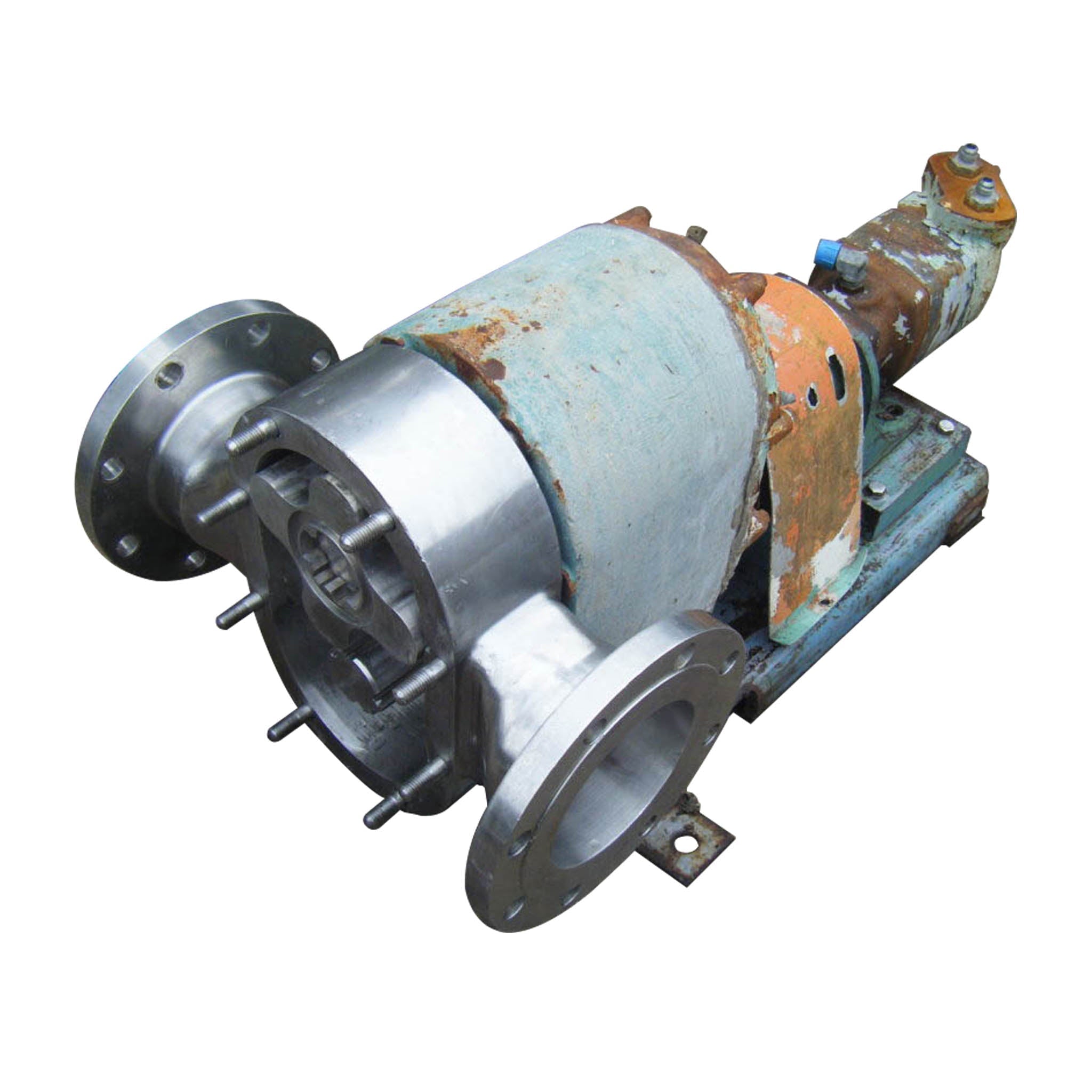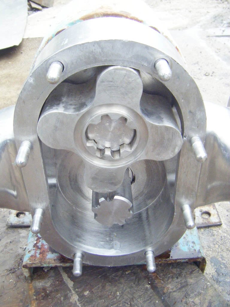 Tri-Clover Positive Displacement Pump. Hydraulic drive. (1) 7-3/4 in. It is missing 1 rotor. Inlet/outlet: (2) 6 in. flange dia. (8) 7/8 in. mounting holes. 3-5/8 in. adjacent, 9-1/2 in. opposite. Overall dimensions: 3 ft. 8 in. L x 1 ft. 8 in. W x 1 ft. 8-1/2 in. H.